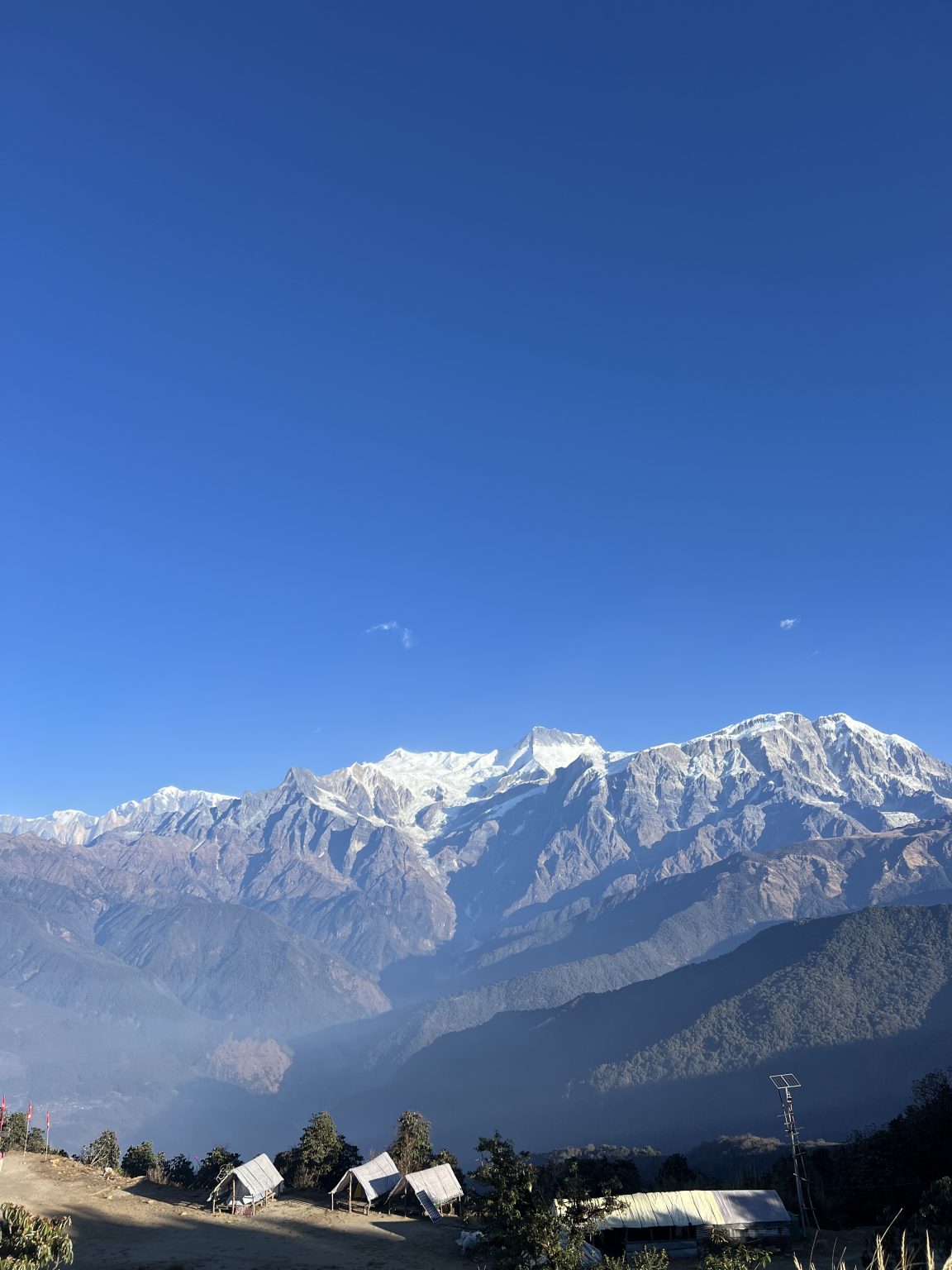 Alternative Text: A breathtaking view of snow-capped mountains under a clear blue sky.