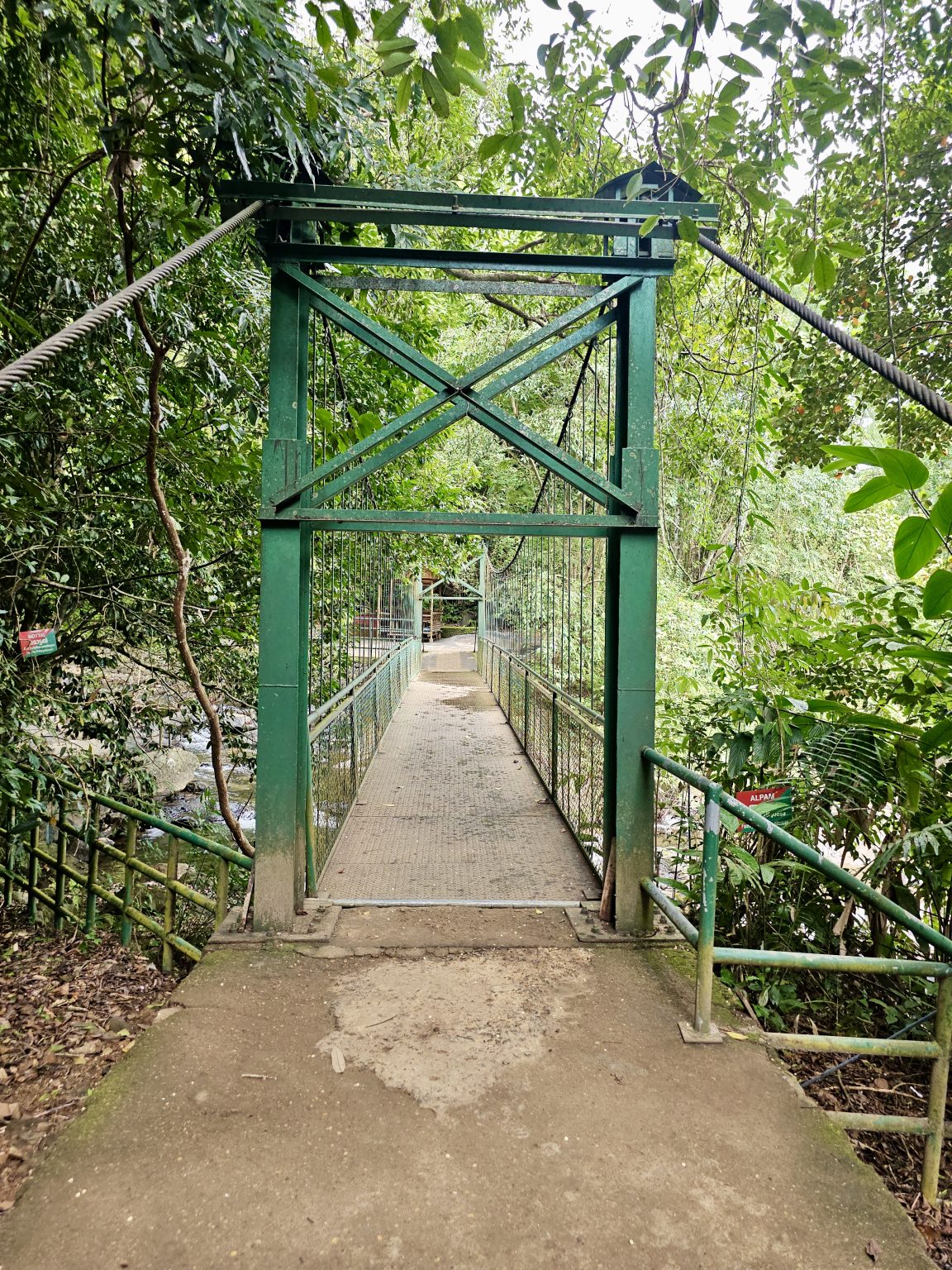Alternative Text: A green suspension bridge surrounded by dense forest at Thusharagiri Falls, Kozhikode. The bridge leads across the stream toward walking trails and waterfalls.