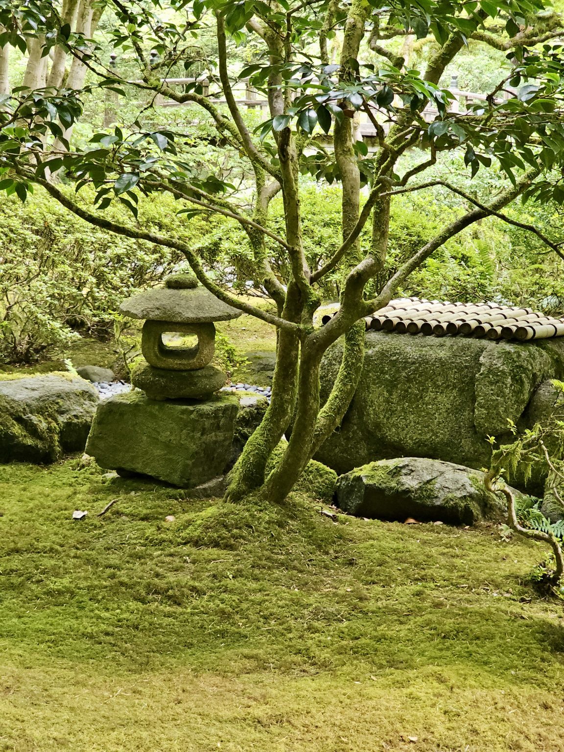Alternative Text: A small, moss-covered stone lantern is placed beside rocks and a tiled stone structure under a tree, surrounded by lush green plants, in the Portland Japanese Garden.