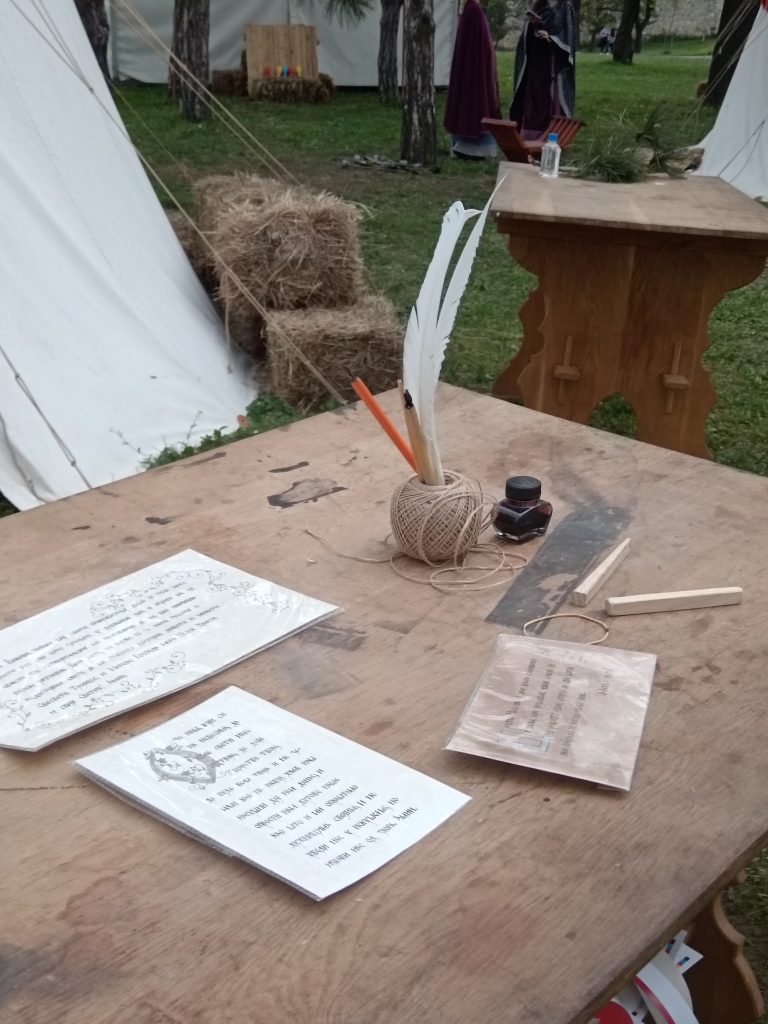 Alternative Text: A writing table in a medieval knights’ camp