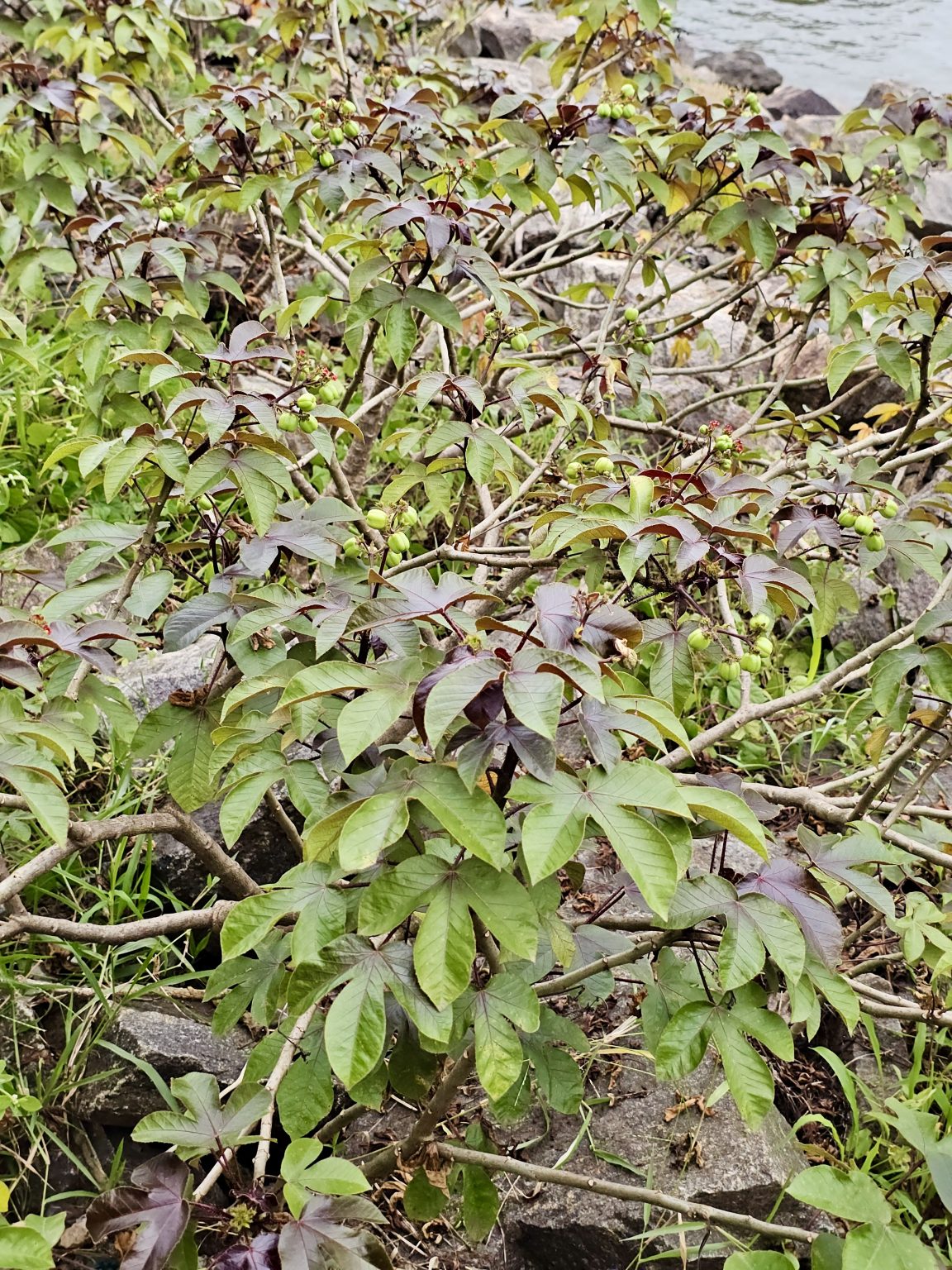Alternative Text: A wider view of castor plants with clusters of green seed pods thriving among rocks near the waterline at Chaliyam Beach, Kozhikode.