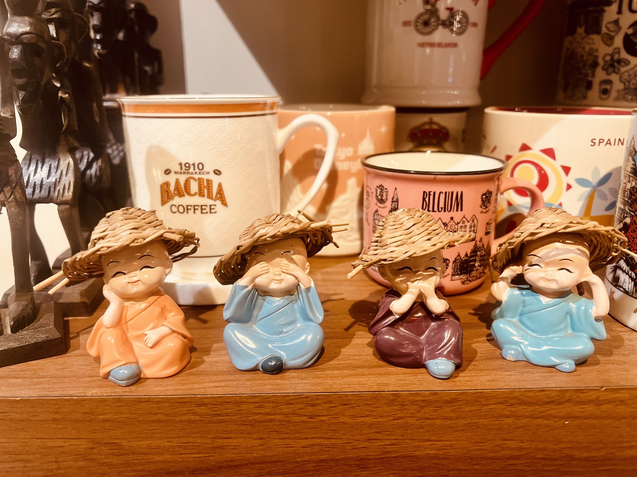Alternative Text: Four cute little monk figurines wearing straw hats pose on a shelf, acting out “see no evil, hear no evil, speak no evil,” while one just relaxes.