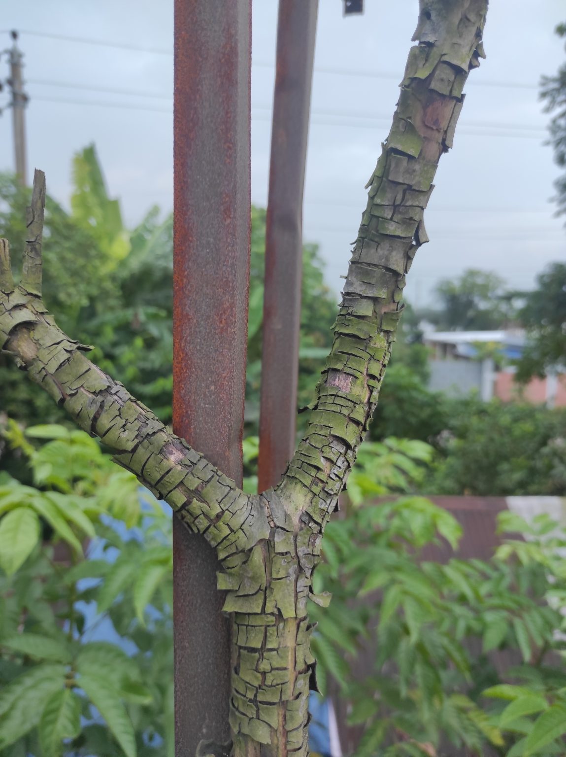 Alternative Text: A close-up view of a textured tree branch with a rough, cracked bark, positioned next to a rusty metal pole.