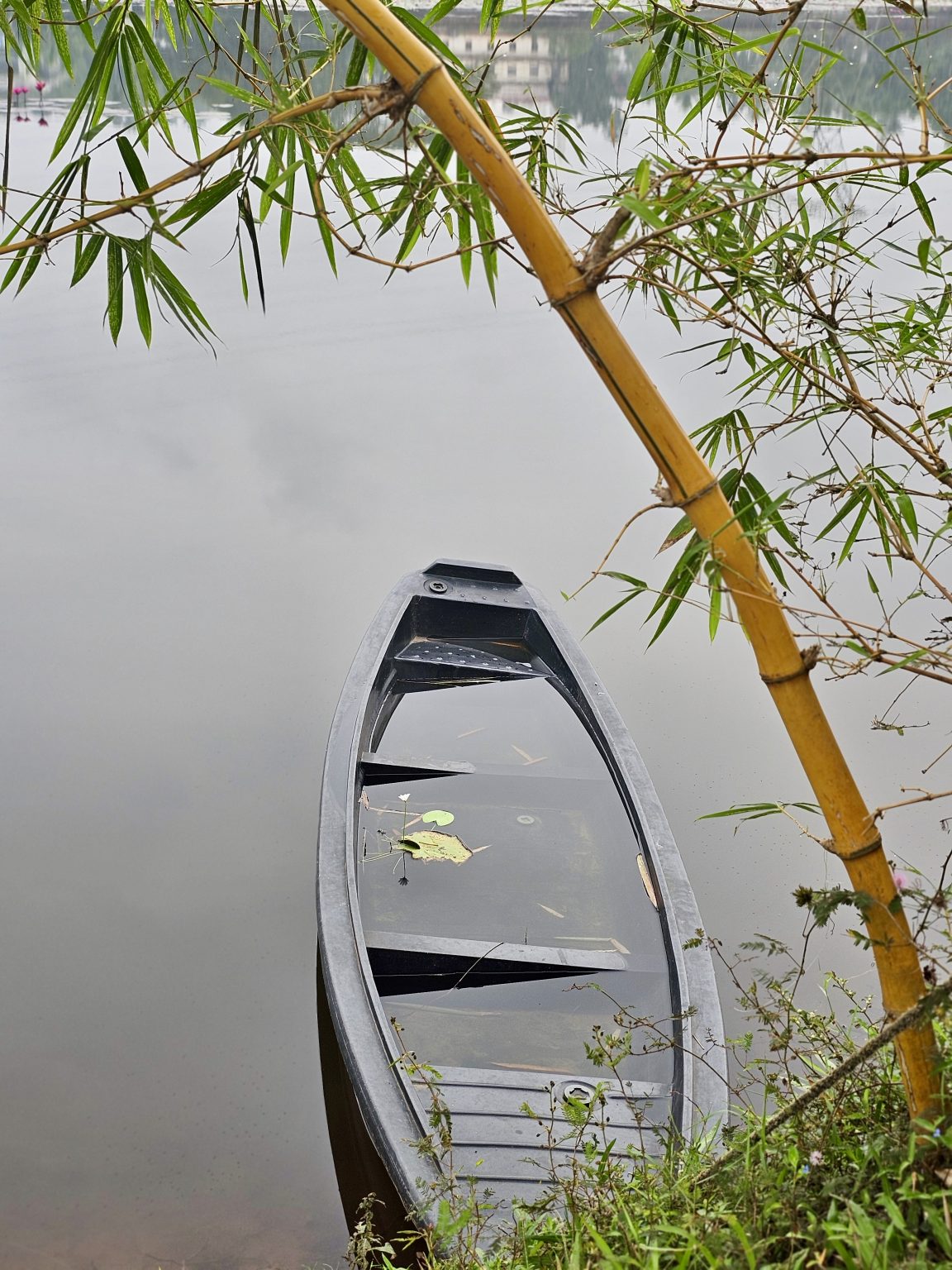 Alternative Text: A close view of a still black boat floating quietly beneath leaning bamboo, reflecting the calm water around it. It creates a peaceful riverside moment in Vazhakkad, Malappuram.