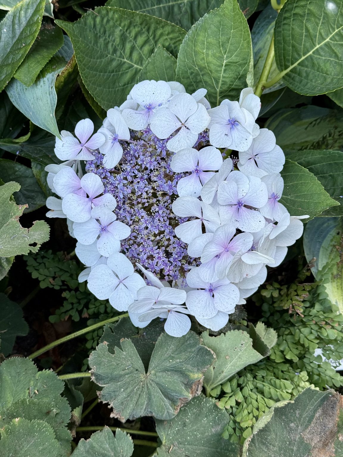 Alternative Text: A top view of a lacecap hydrangea flower with tiny purple buds in the center and large white petals. Taken in the evening at Pittock Mansion, Portland.