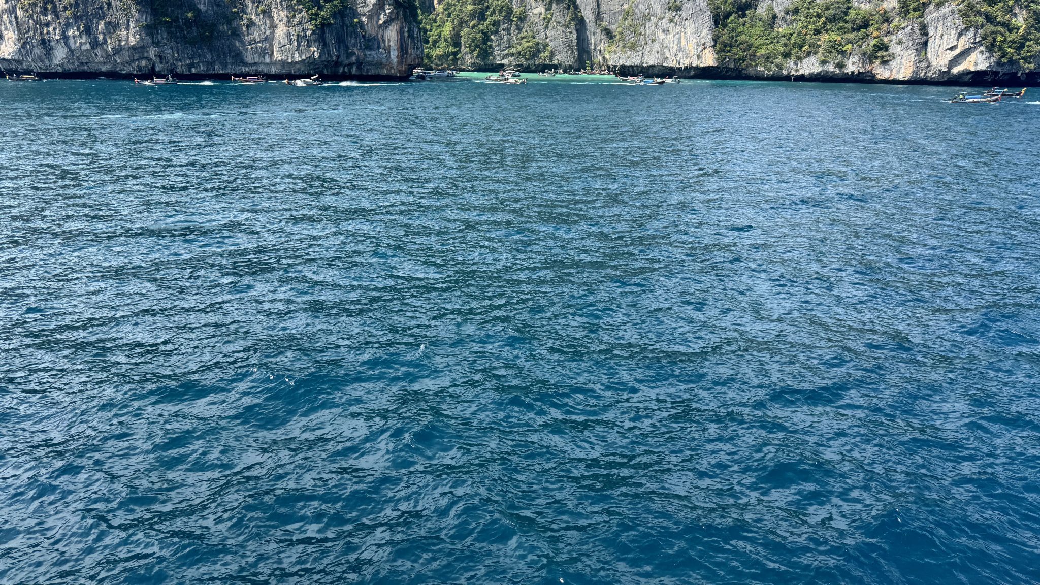 Alternative Text: A view focusing on the rippling surface of deep blue and turquoise ocean water, with a distant glimpse of limestone cliffs and boats anchored along the top edge.