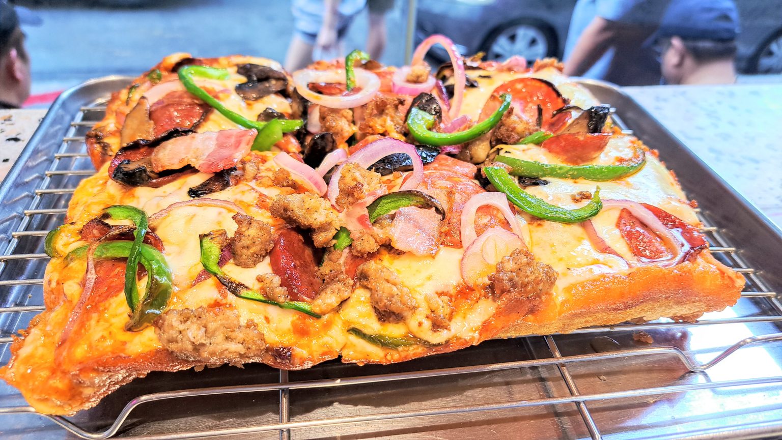Alternative Text: A freshly baked pizza on a metal cooling rack, topped with a variety of ingredients including slices of pepperoni, green bell peppers, onions, mushrooms, and pieces of sausage