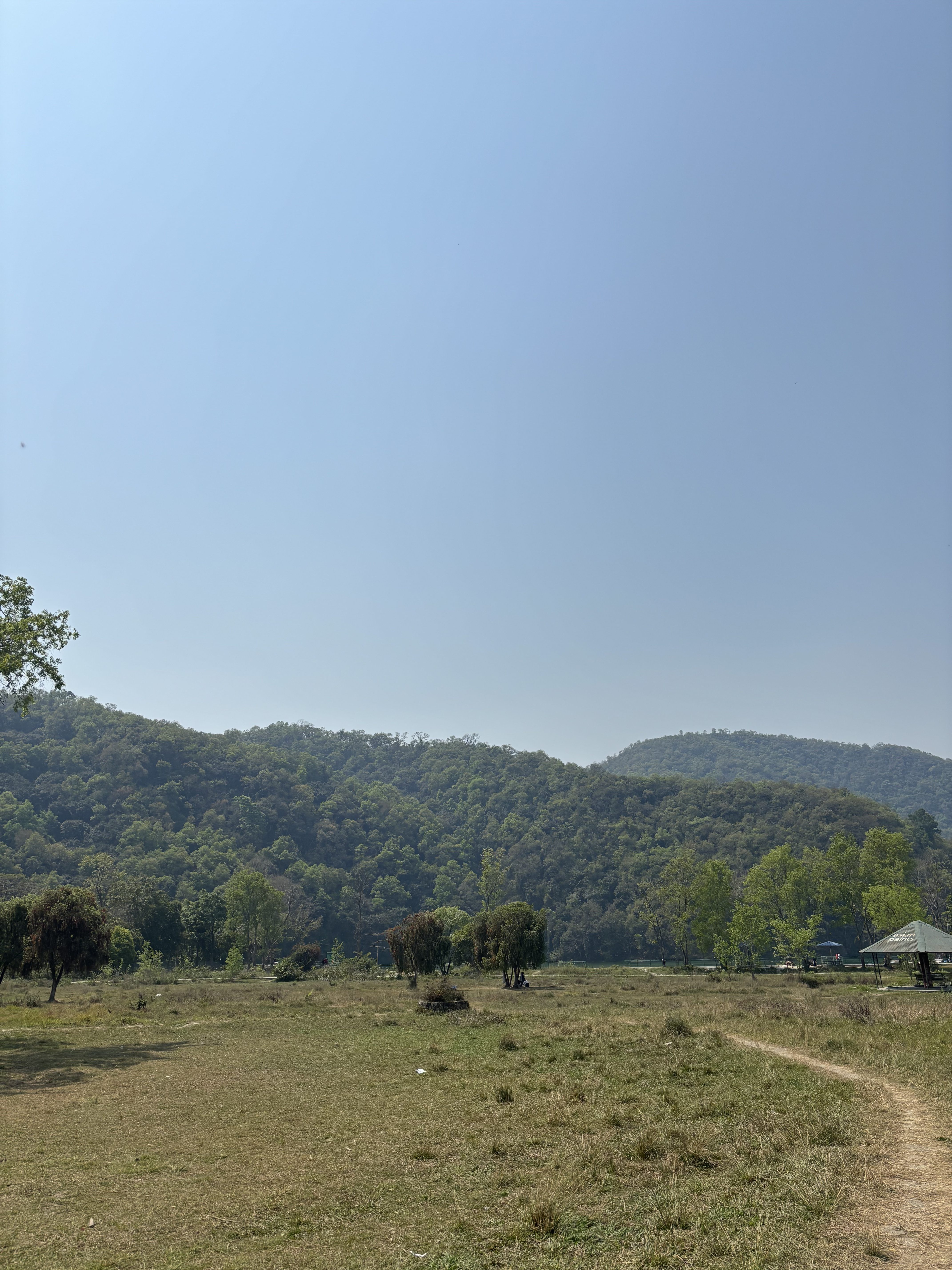 Alternative Text: A scenic landscape featuring rolling green hills under a clear blue sky, with grassy fields in the foreground.Sparse trees dot the area, and a winding path leads through the grass.