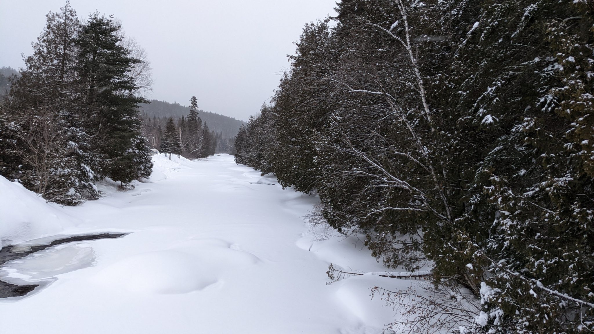 Alternative Text: Canadian winter, frozen river in the middle of the forest.
