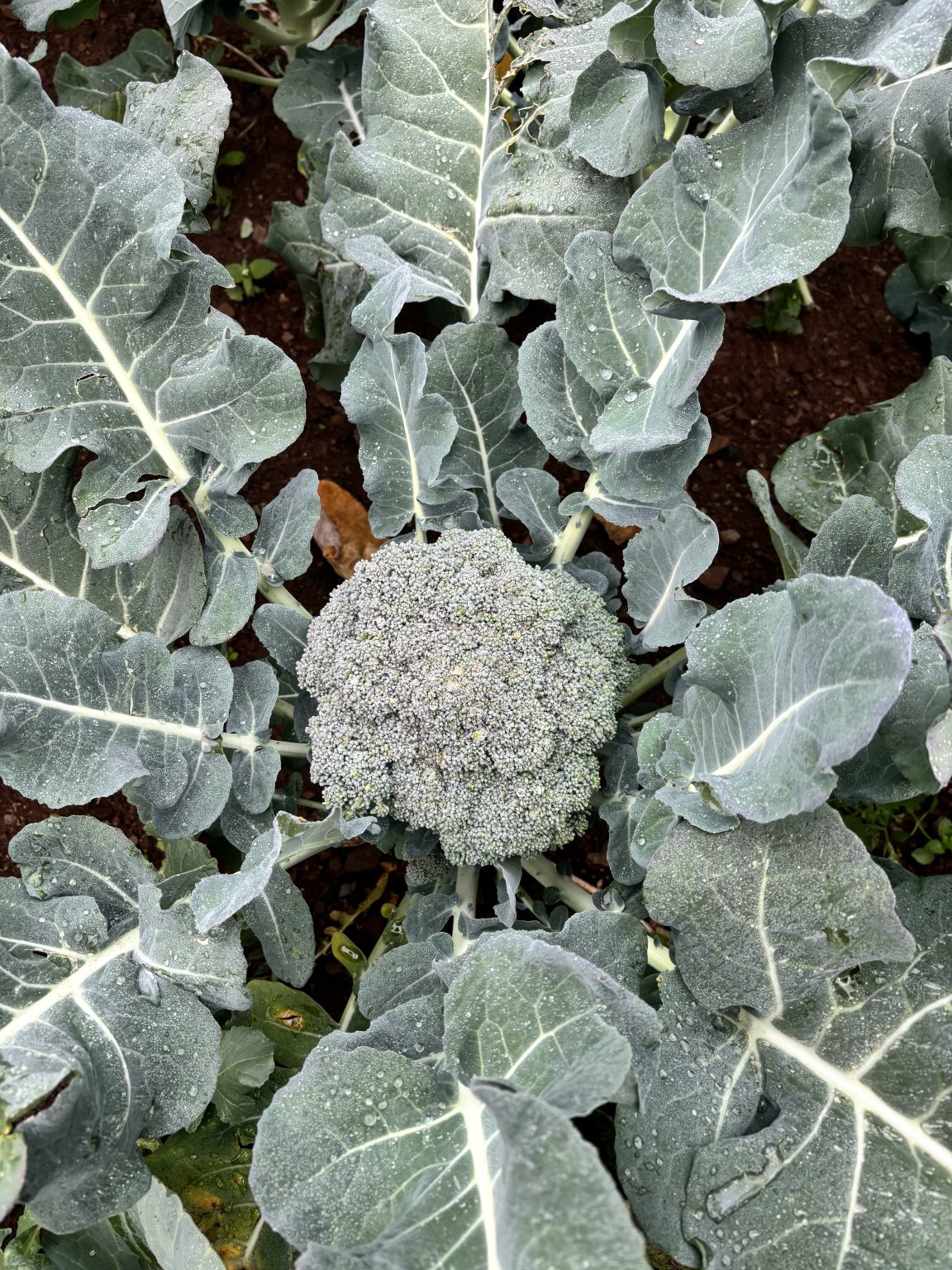 Alternative Text: A close-up view of a fresh broccoli head surrounded by large, green leaves with visible water droplets on their surface, set against dark soil.