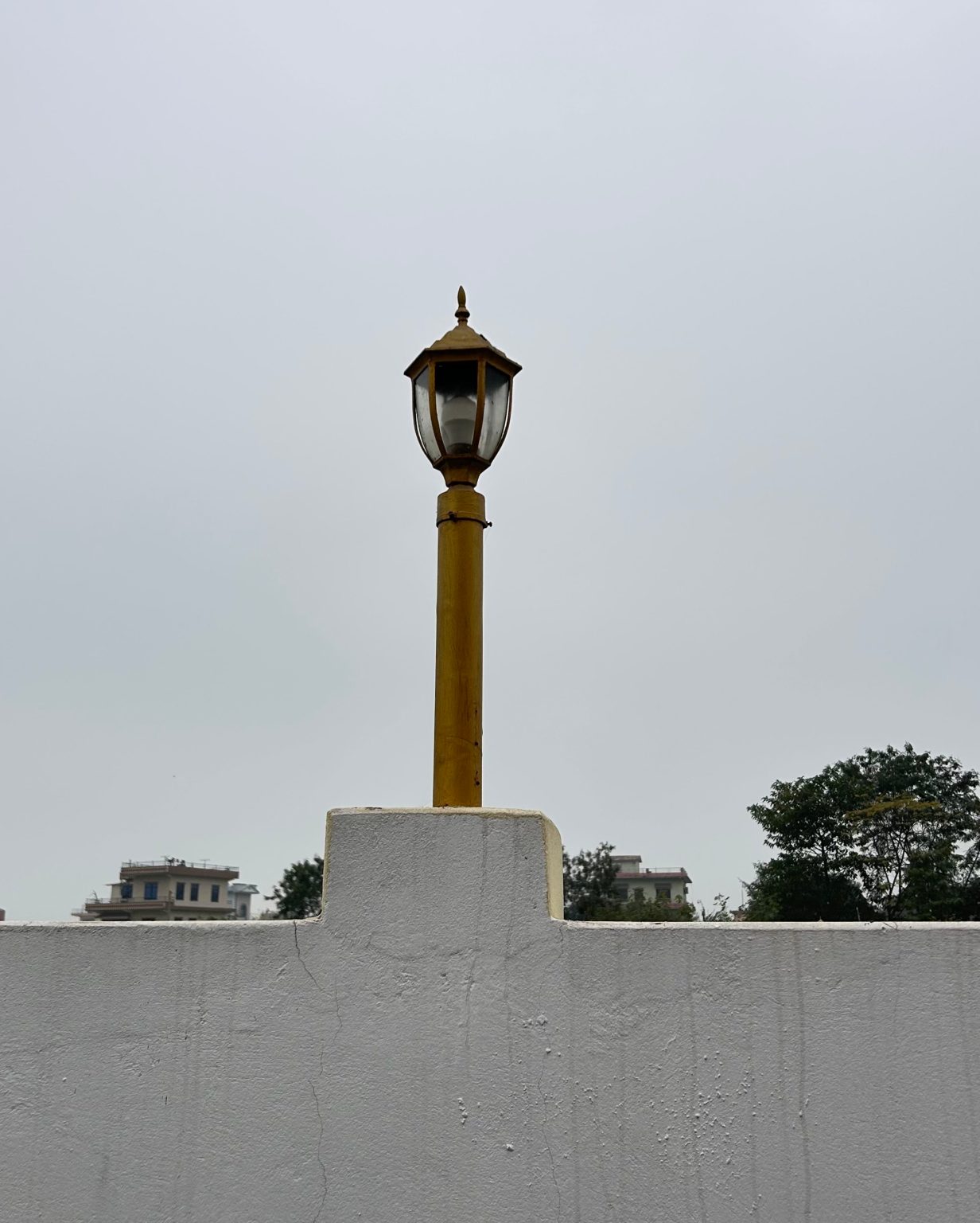 Alternative Text: A tall, decorative wall lamp with a glass enclosure sits atop a yellow pole against a gray sky