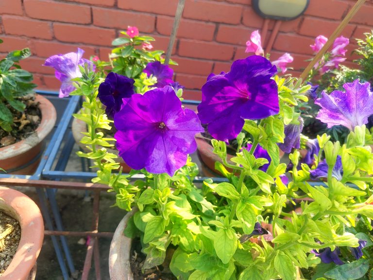 Alternative Text: A vibrant display of blooming petunias in various shades of purple and pink, surrounded by lush green foliage.
