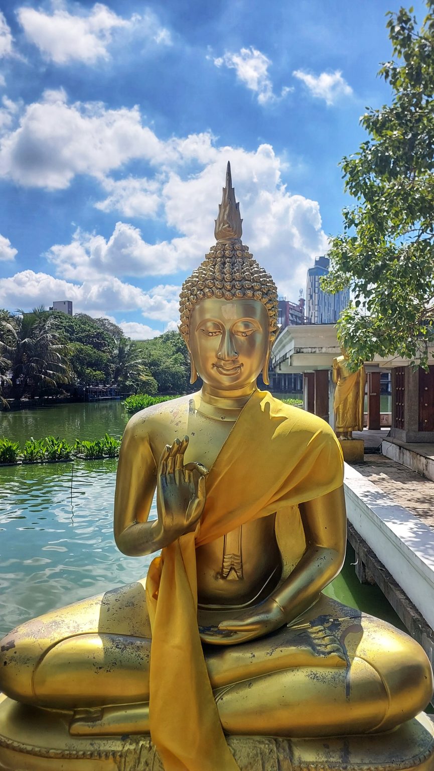 Alternative Text: A golden budha statue with a pond with a blue sky in the background