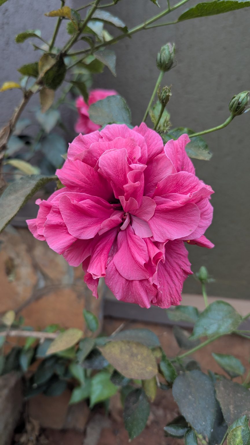 Alternative Text: A close-up of a vibrant pink flower with numerous ruffled petals, surrounded by green leaves and buds. The background features a gray wall.