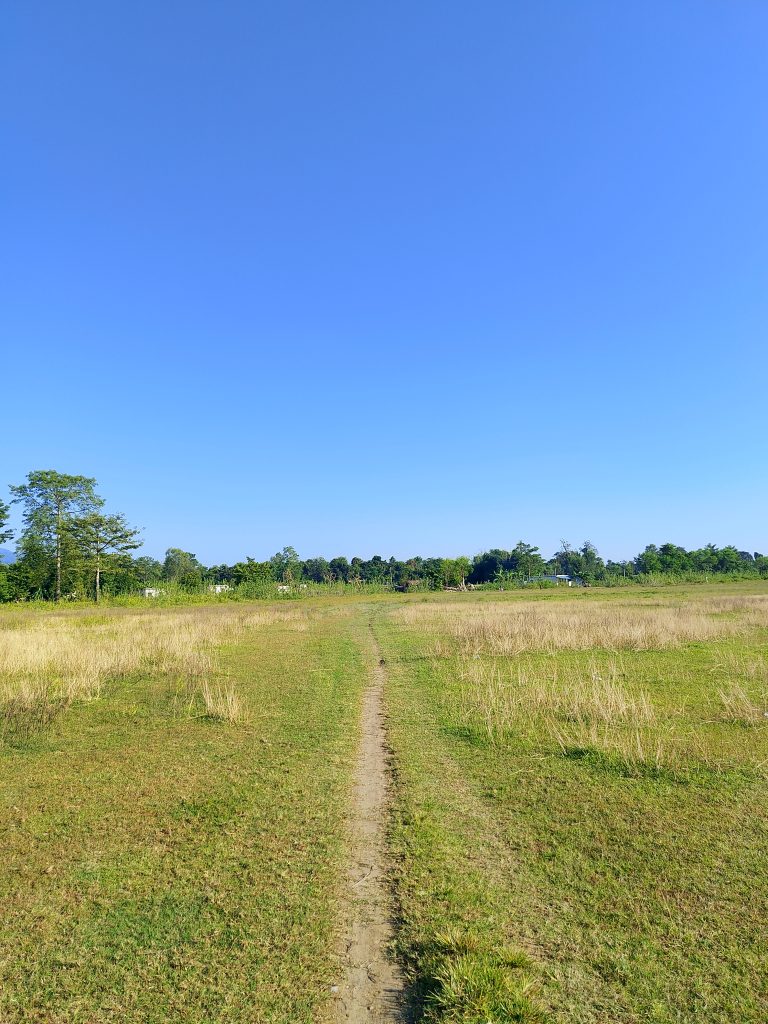 Alternative Text: A narrow dirt path winds through a grassy field under a clear blue sky.