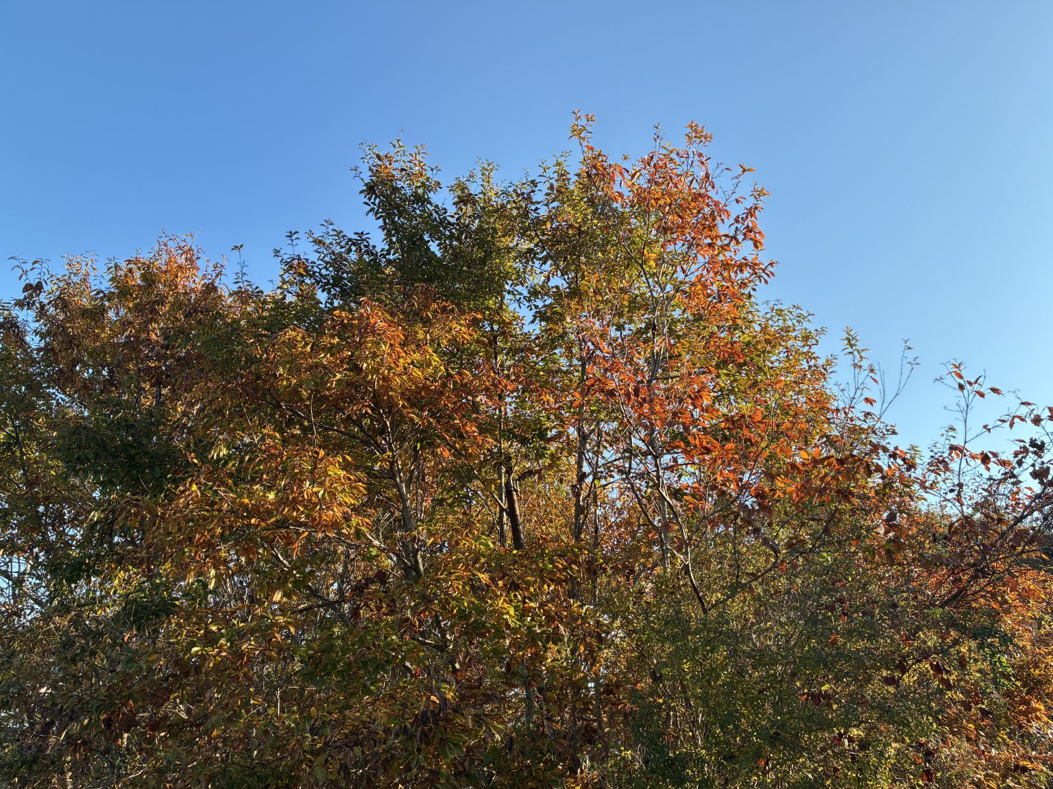 Alternative Text: A vibrant display of autumn foliage, featuring trees with leaves in shades of orange, red, and green against a clear blue sky.