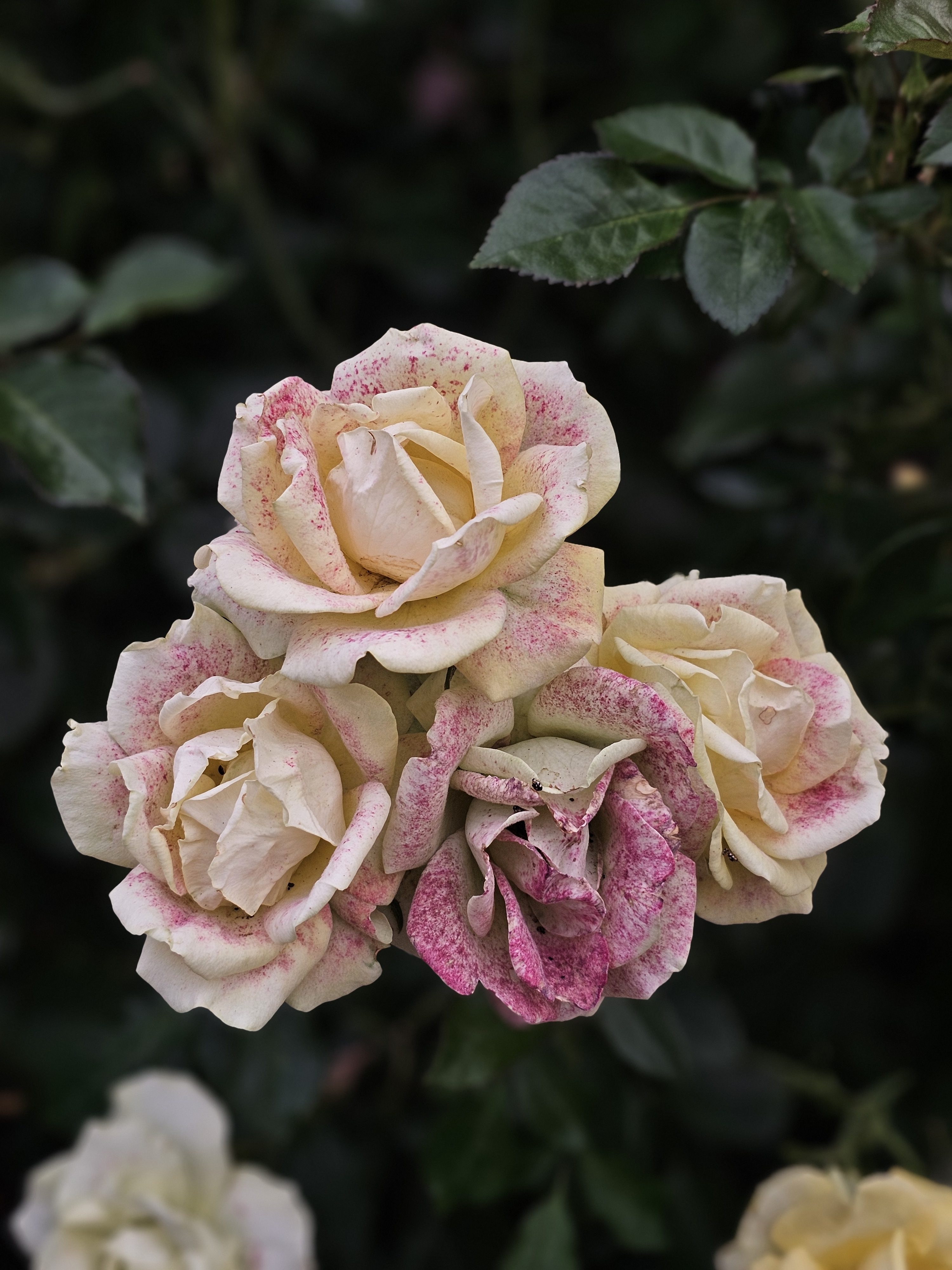 Alternative Text: A cluster of cream-colored roses delicately speckled with pink edges, captured in soft light at Washington Park’s rose garden in Portland, Oregon.