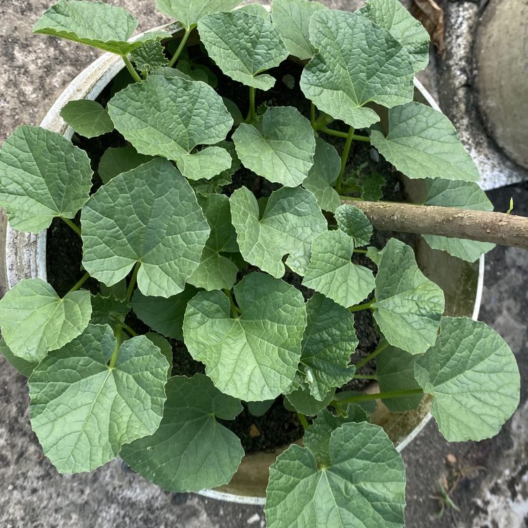 Alternative Text: A healthy cucumber plant with lush green, heart-shaped leaves grows in a round pot on a concrete surface, suggesting a calm, nurturing garden setting.