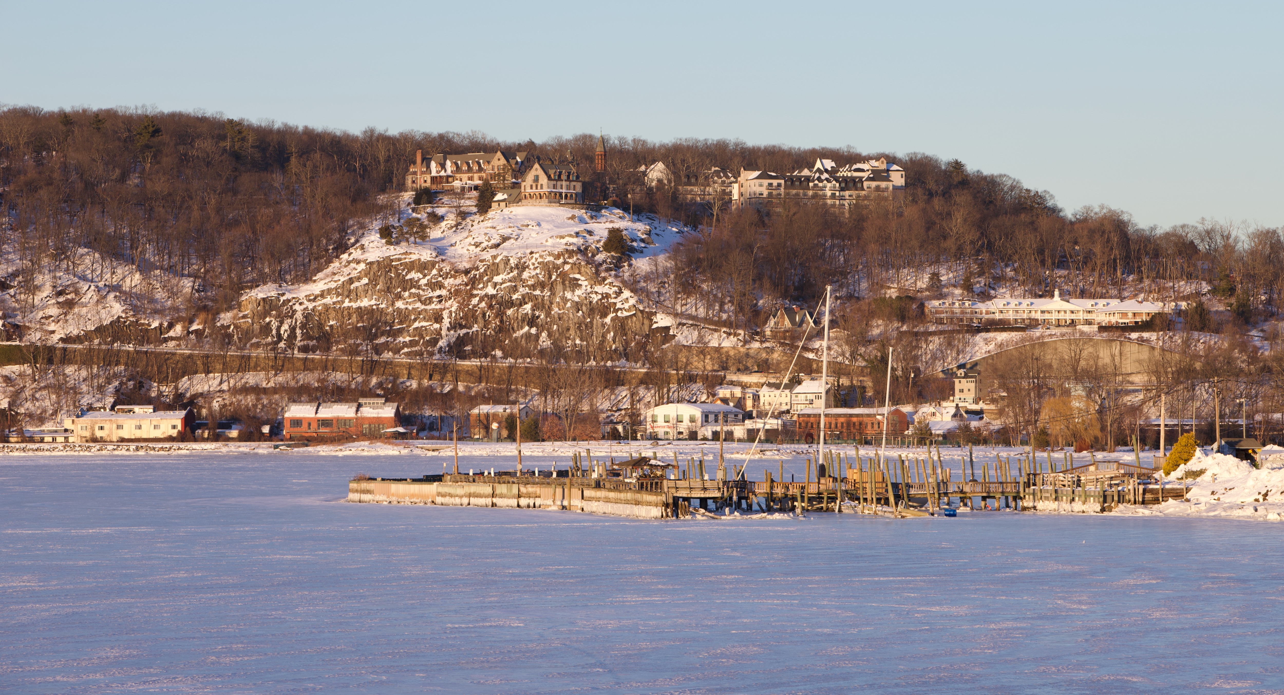 Alternative Text: An iced over Peekskill Bay with the sailing club docks in the foreground and the Abbey up on the hill in the background.