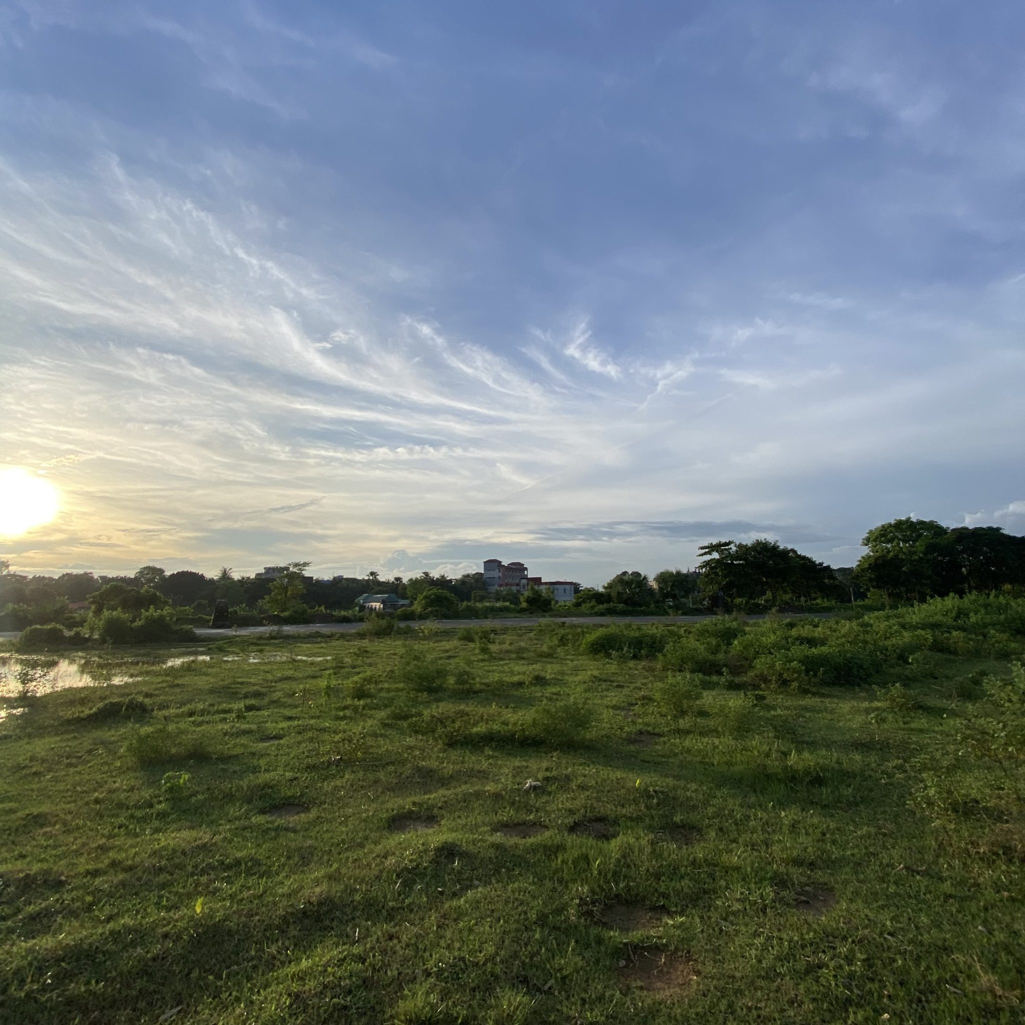 Alternative Text: A scenic landscape featuring a grassy field with patches of greenery, bordered by trees.