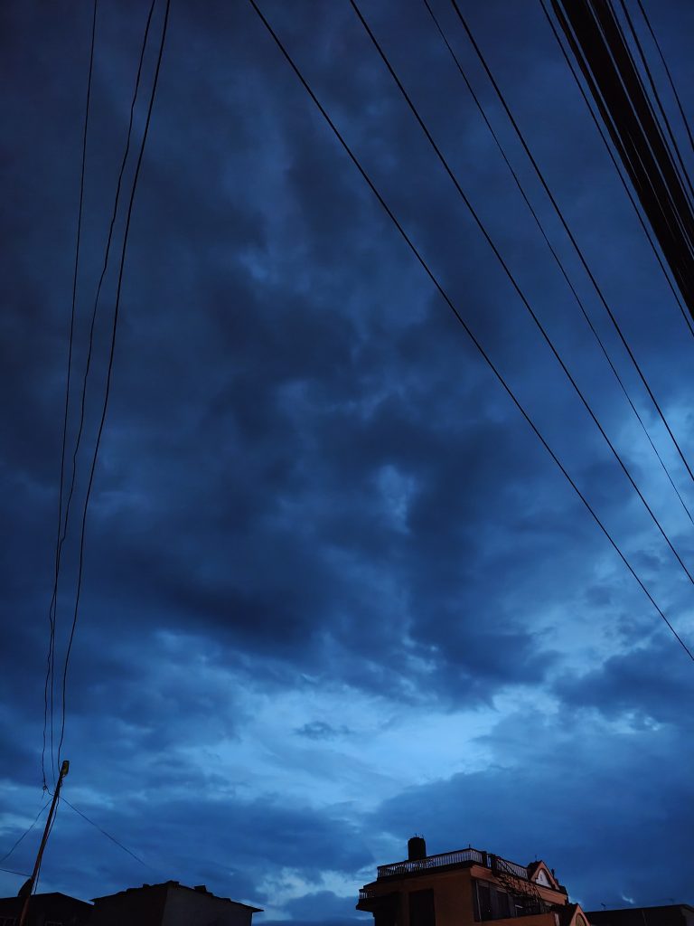 Alternative Text: A dark blue sky filled with thick, swirling clouds; overhead power lines crisscross the scene.