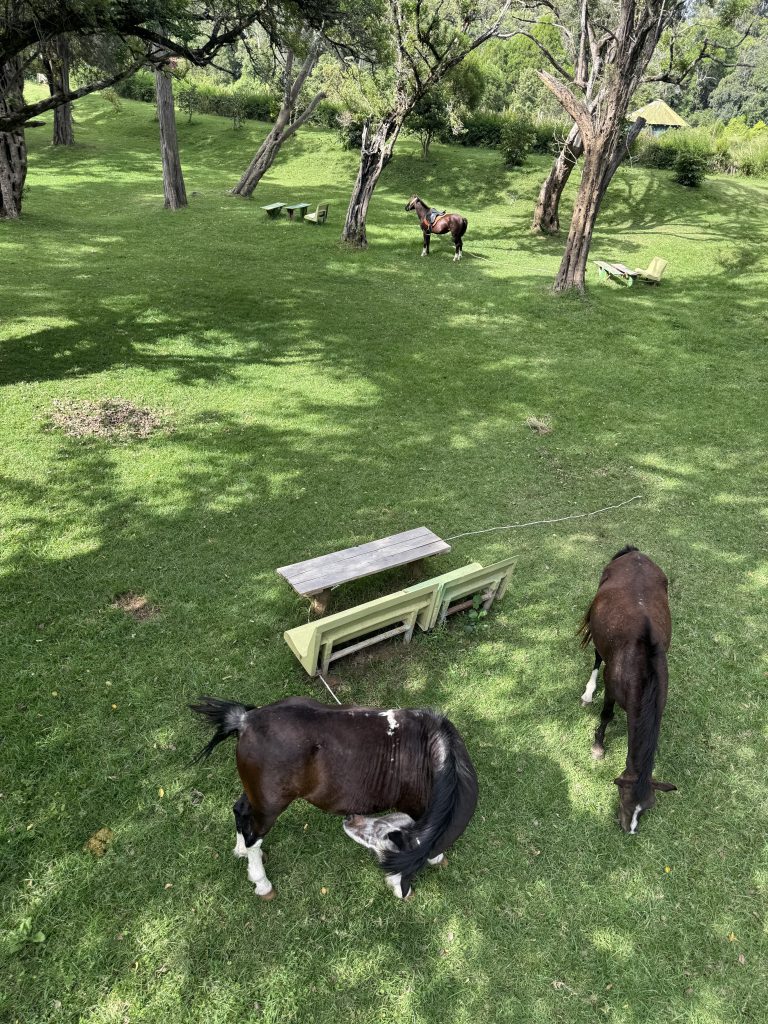 Alternative Text: A top-down view of two horses grazing in a grassy field with several trees.In the background,another horse is visible near some benches.#SummerPhotoContest