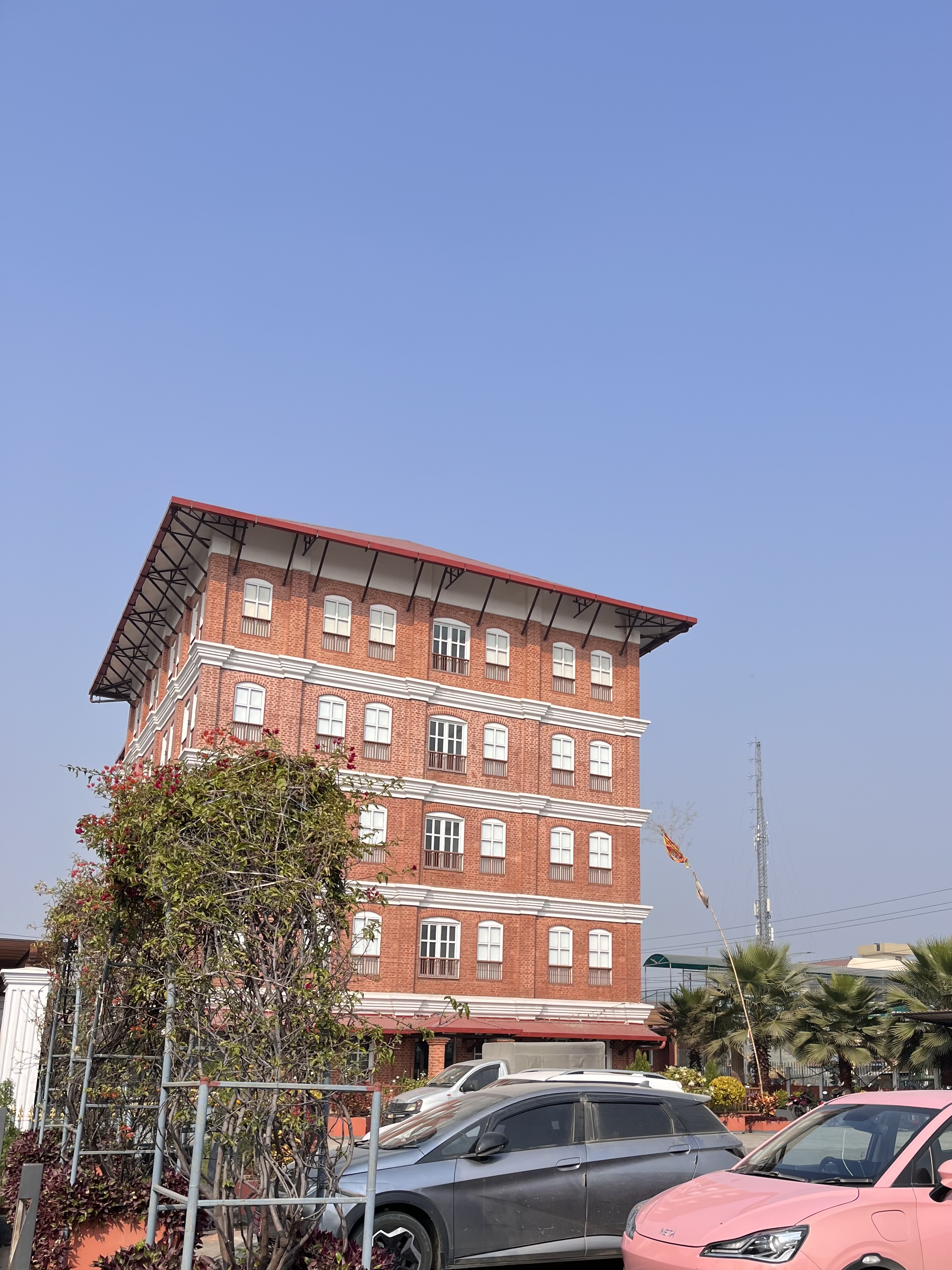 Alternative Text: A red brick building with a flat roof and white window frames stands against a clear blue sky. In front of the building are several parked cars, including a pink one, along with greenery and decorative plants.