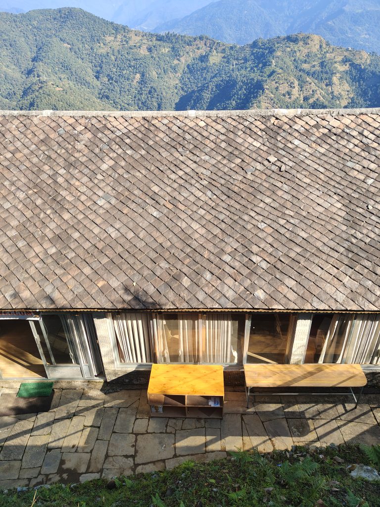 Alternative Text: An aerial view of a rustic wooden structure with a sloped roof, surrounded by lush green hills and mountains in the background.