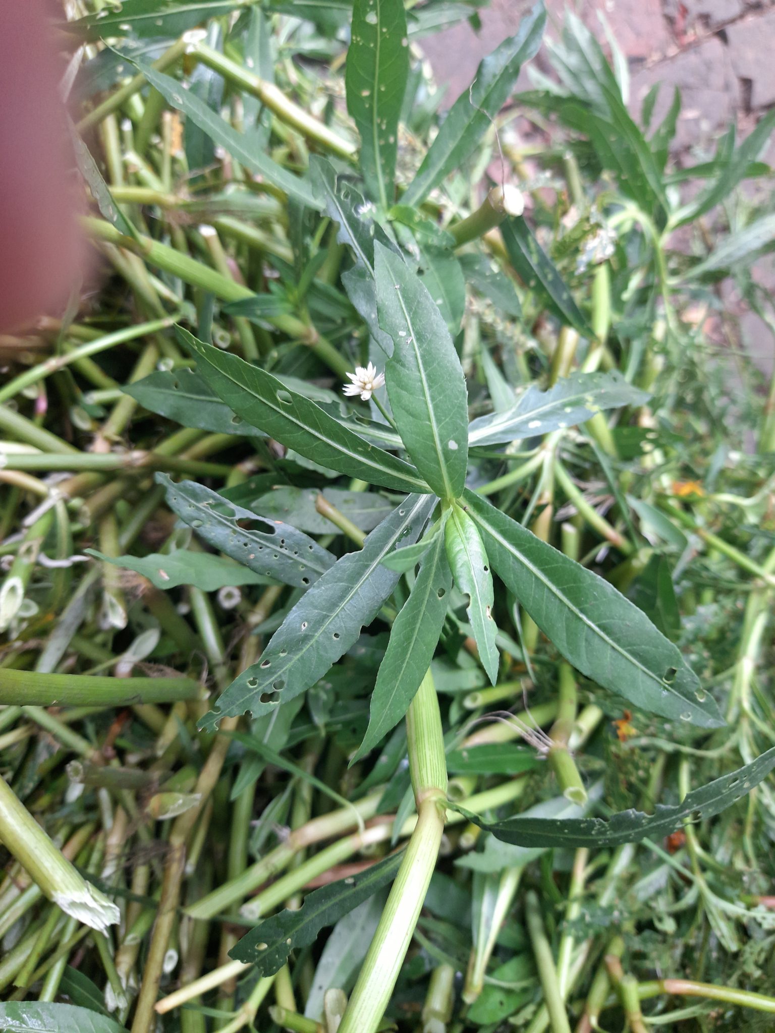 Alternative Text: A close-up view of green leaves and stems, some with noticeable holes and damage, lying among a mass of cut greenery.