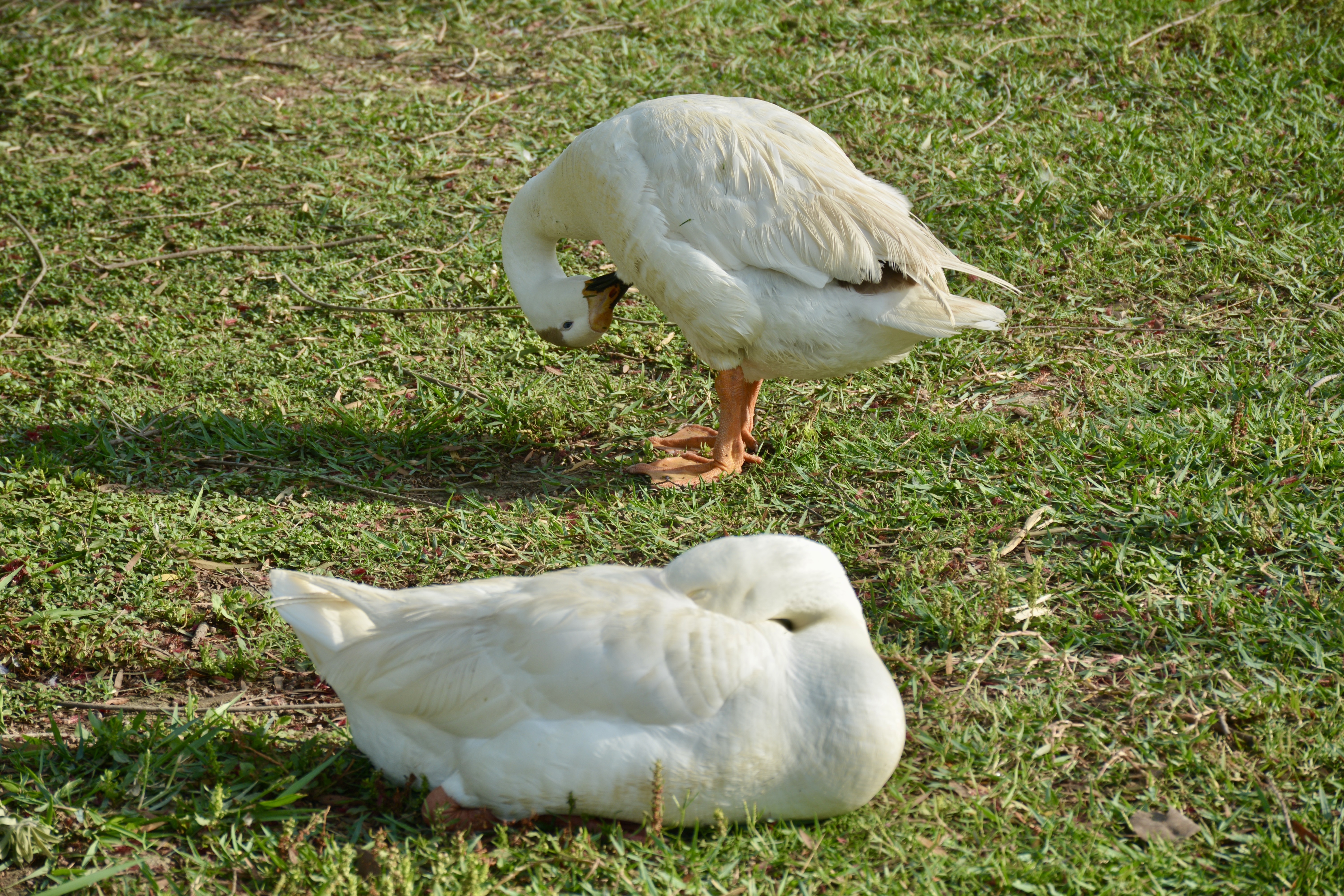 Alternative Text: Two white ducks relax on the soft green grass at Raj Ghat, Delhi. One duck is resting with its head tucked under its wing, while the other is standing and preening its feathers in the warm sunlight.