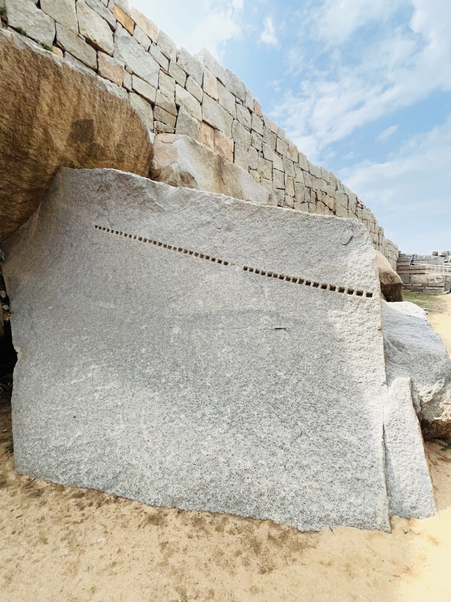 Alternative Text: A stone with multiple dots. From the sites of Royal Enclosure and Pushkarani in Hampi, Karnataka.