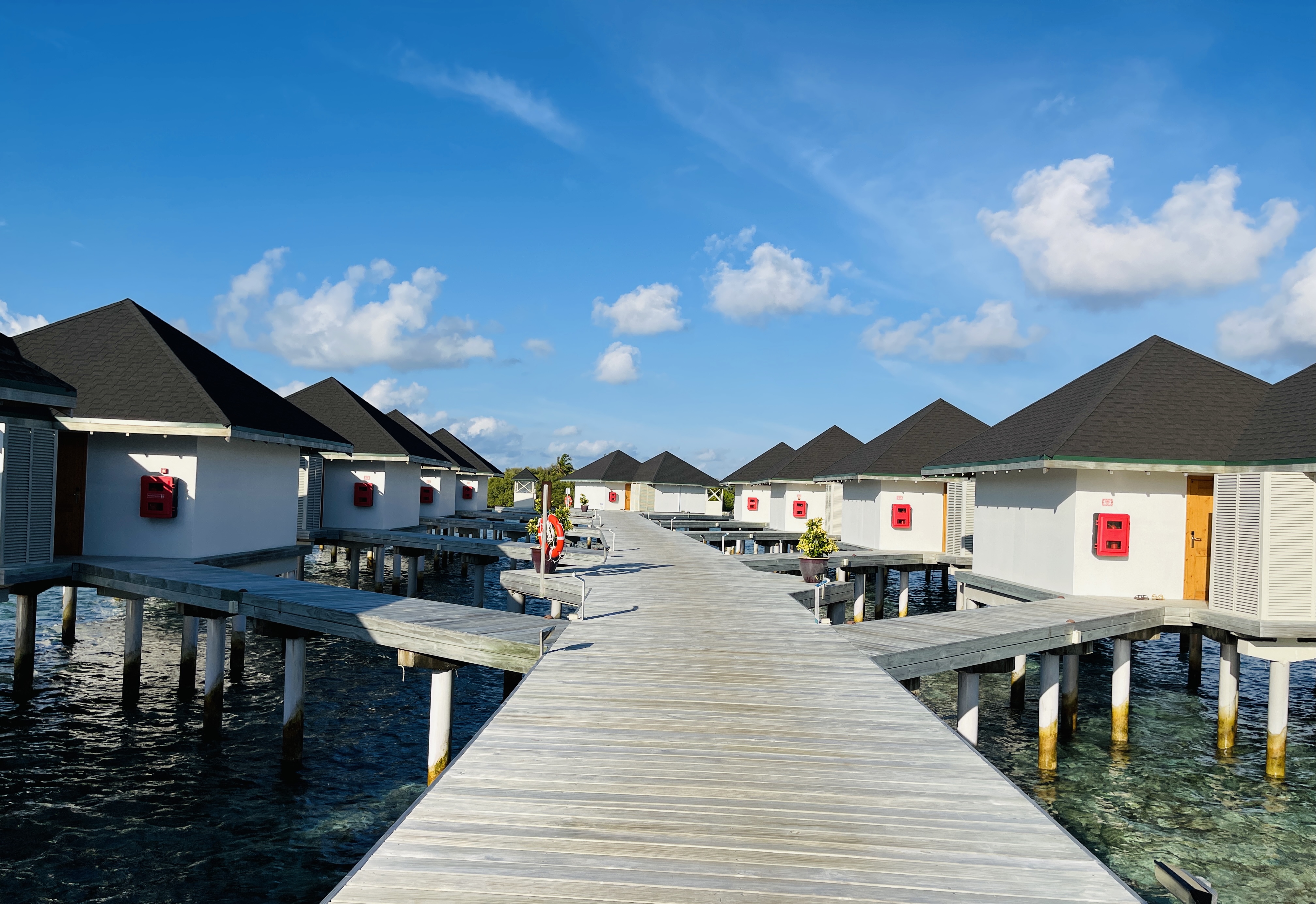 Alternative Text: A wooden pathway extends over clear blue waters, leading to a series of overwater bungalows with sloped roofs.