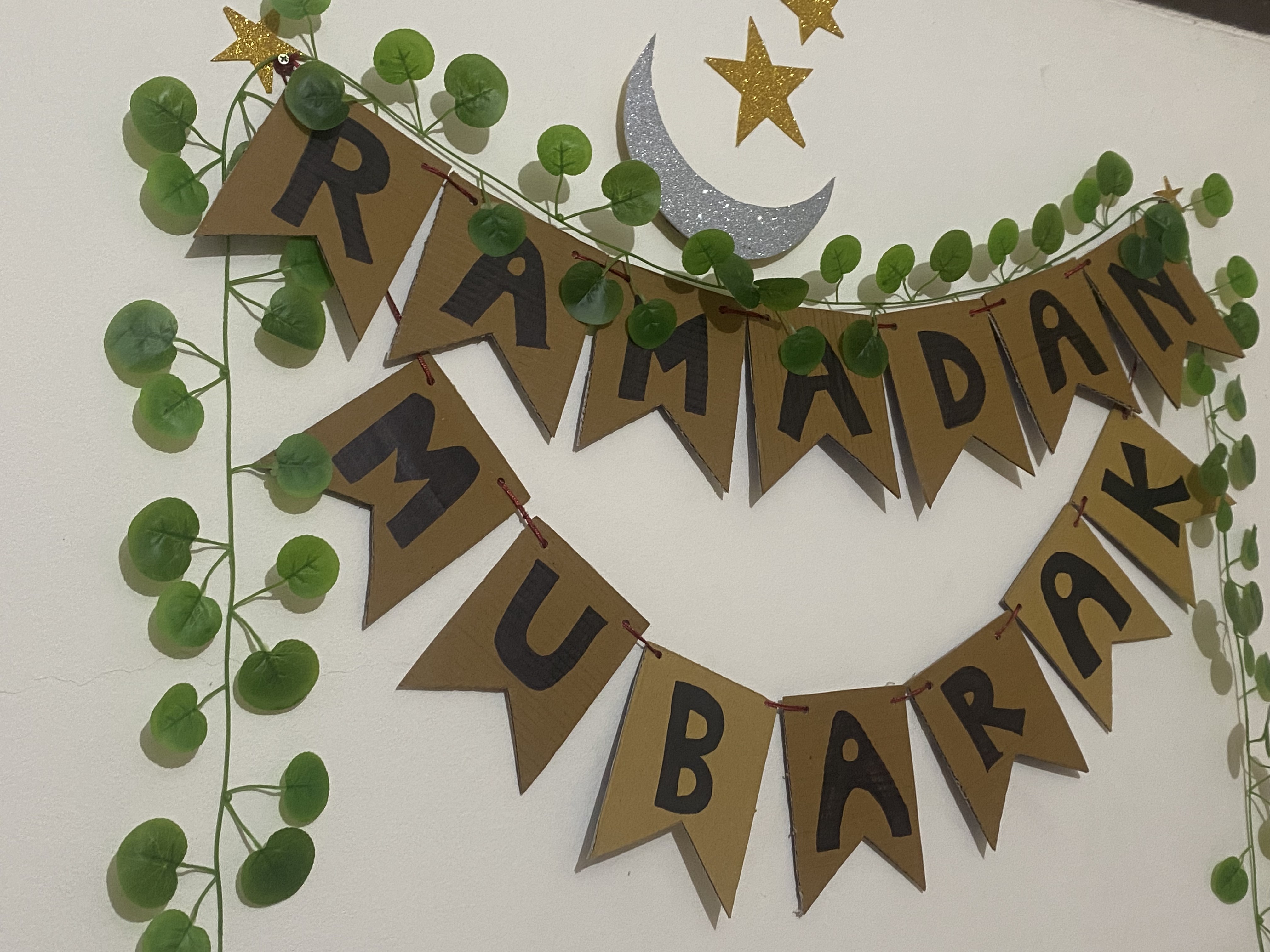 Alternative Text: Decorative “Ramadan Mubarak” banner with green leaf garland, golden stars, and a silver crescent moon on a white wall, conveying festive cheer.