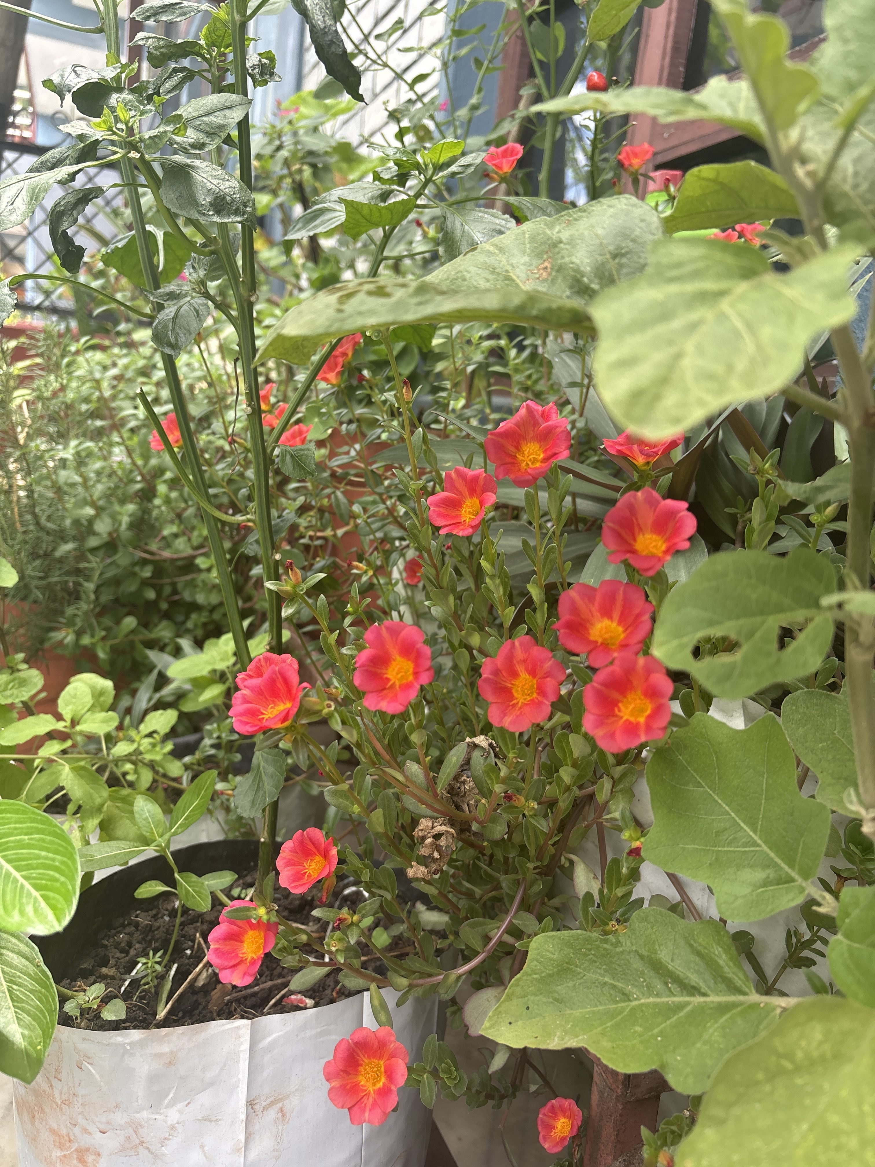 Alternative Text: A close-up view of vibrant yellow and pink flowers blooming among lush green foliage in a garden setting.