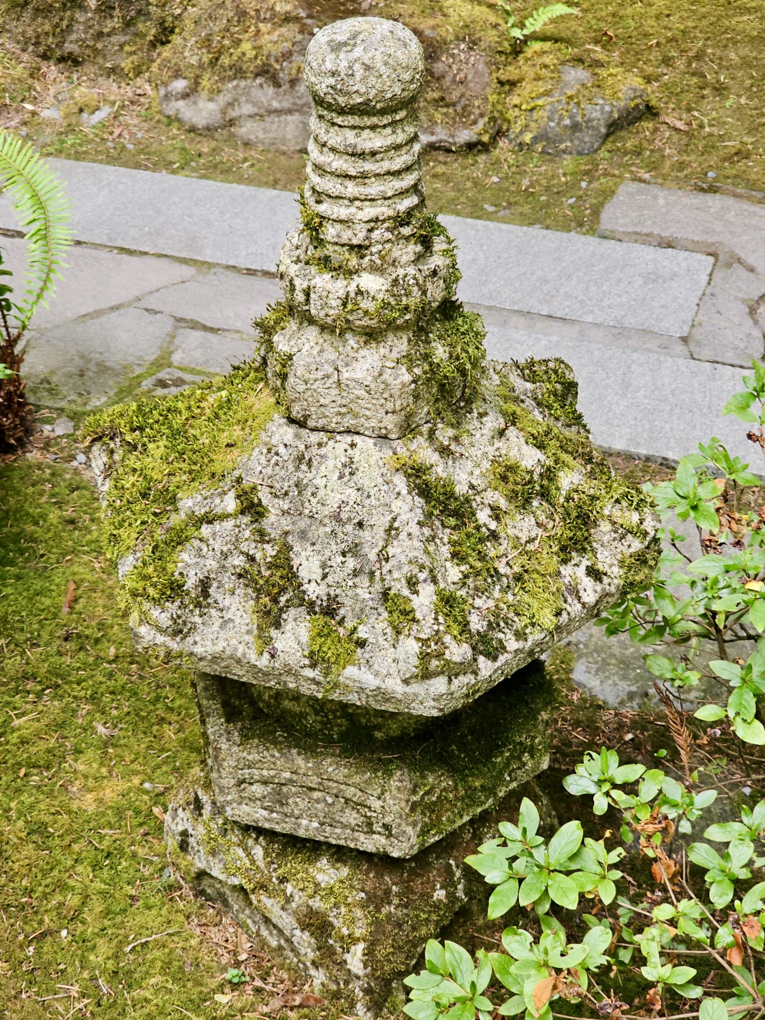 Alternative Text: A weathered stone pagoda-style lantern with moss growing on its surface, surrounded by small plants and a stone path, was captured at Portland Japanese Garden.
