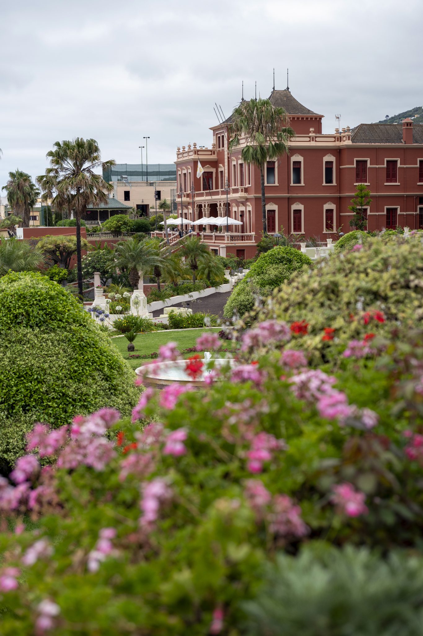 Alternative Text: A grand red building with ornate architecture stands behind lush, manicured gardens filled with colorful flowers, palm trees, and a central fountain, under a cloudy sky. La Orotava (Tenerife-Spain)