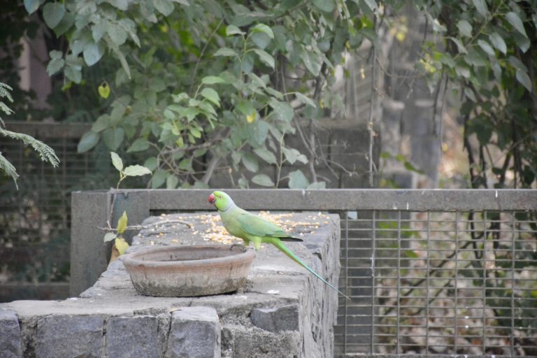 Alternative Text: A Rose-ringed Parakeet (Psittacula krameri) perched near a clay bowl, enjoying grains in a peaceful corner of Delhi.