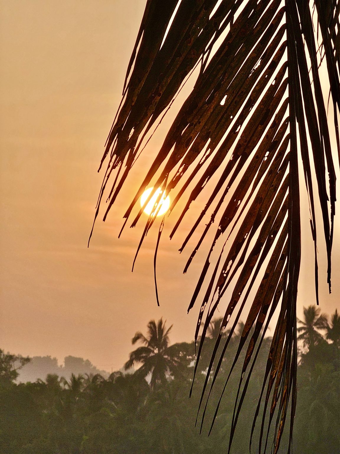Alternative Text: Sunrise view through a coconut leaf. From Perumanna, Kozhikode, Kerala.