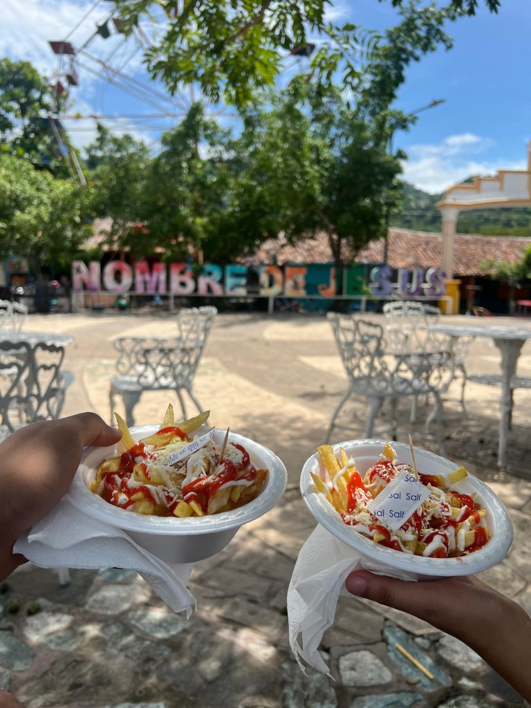 Alternative Text: French fries topped with mayonnaise, ketchup, and shredded cheese—commonly called papas chucas.