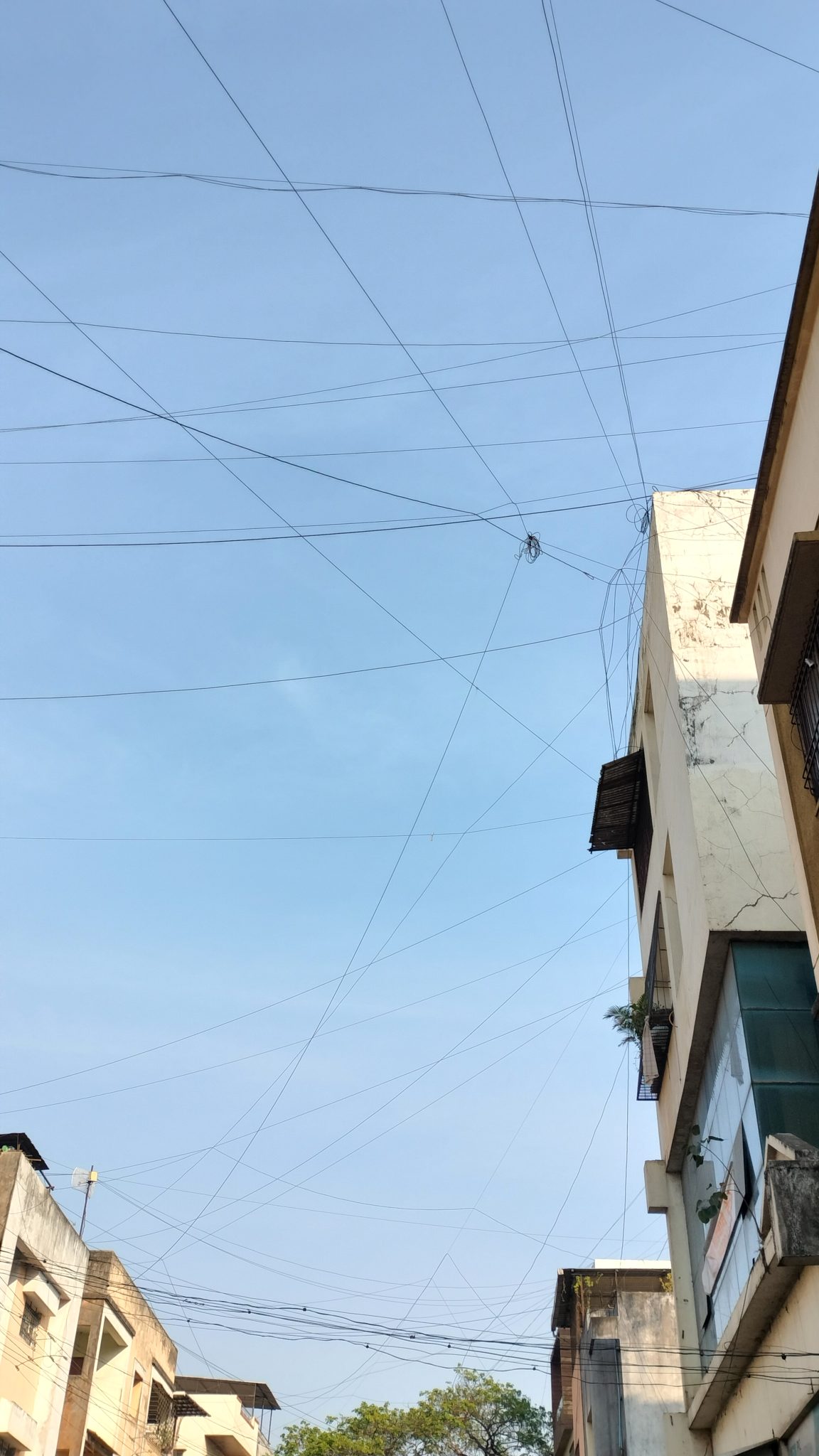 Alternative Text: A mesh of cable network over buildings in city