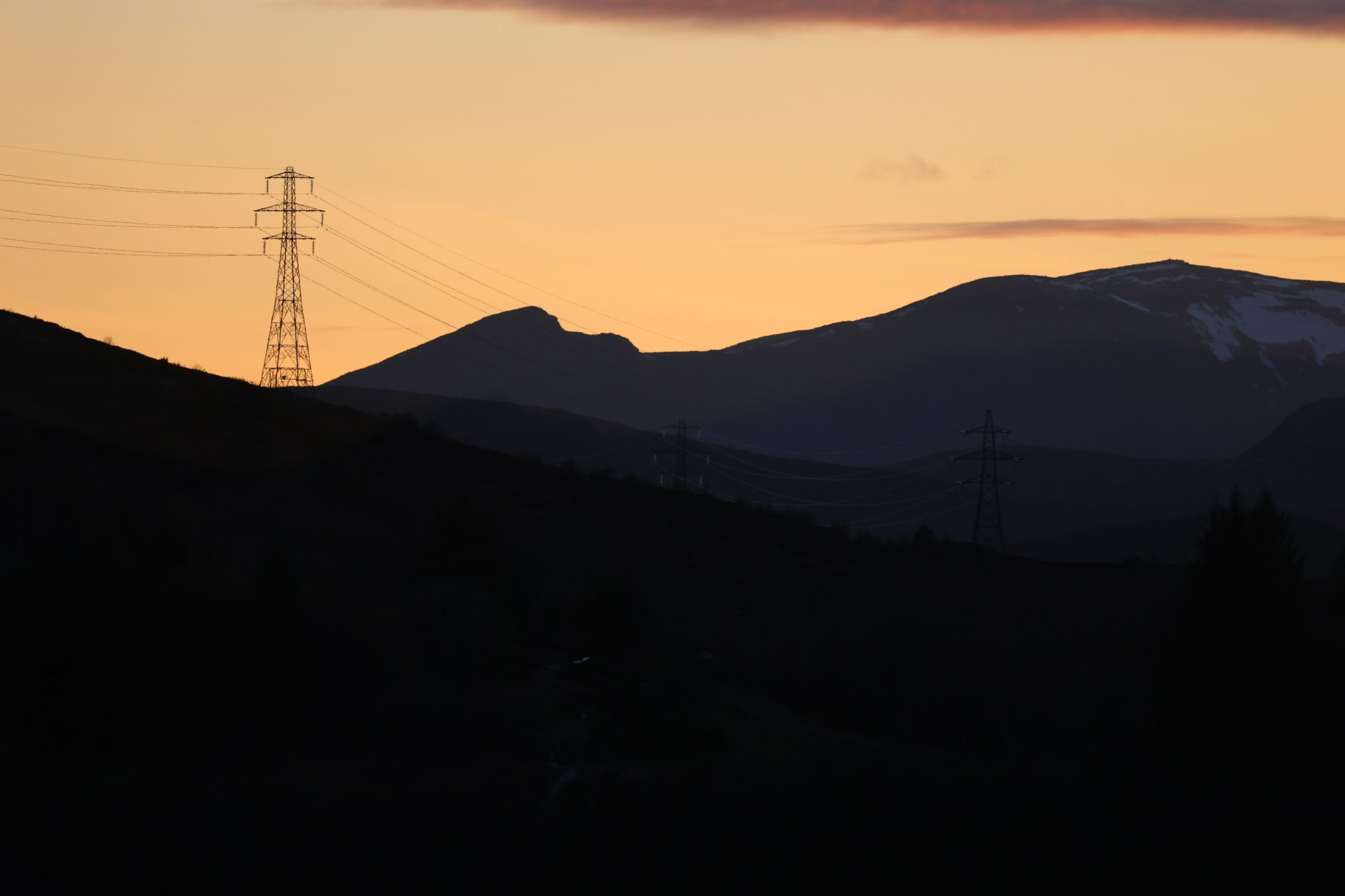 Alternative Text: Electricity pylon in silhouette on a hill against a mountainous sunset sky, Scottish Highlands