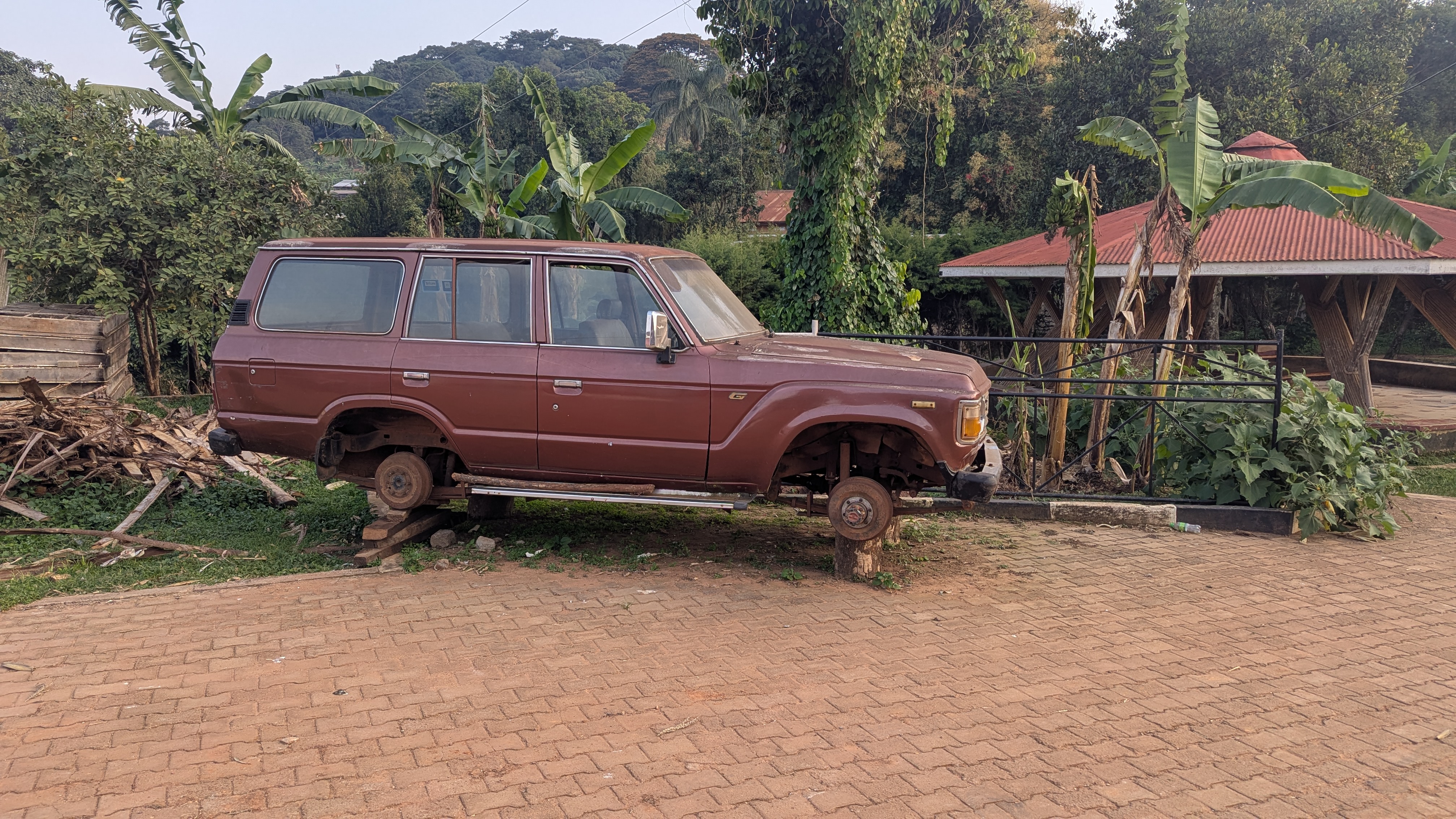 Alternative Text: An abandoned brown SUV is propped up on wooden blocks, missing its wheels.