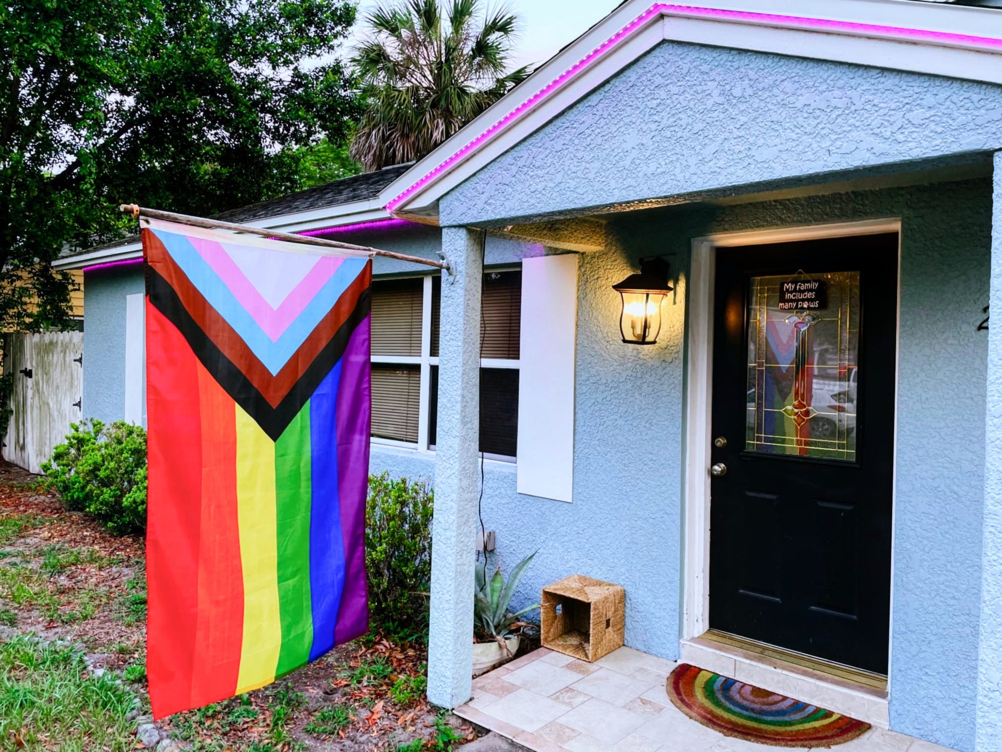 Alternative Text: An inclusive pride flag on a pole hanging down in front of a light blue house. The house has pink lights along white trim, a brown door with a sign on it, and a rainbow welcome mat.