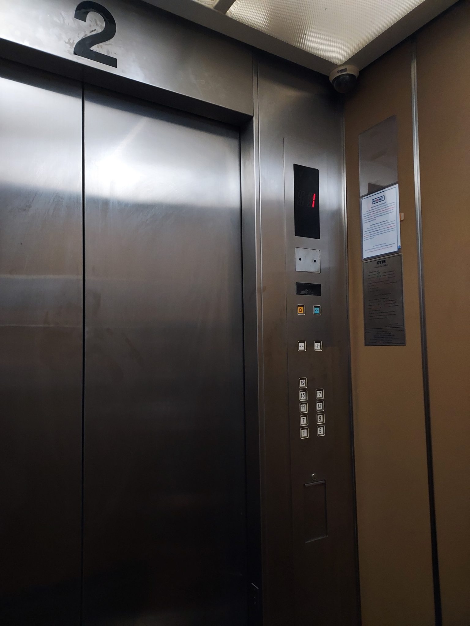 Alternative Text: The inside of an elevator, showing metal doors, a control panel with floor buttons, and a digital floor display. The space looks compact and modern, with neutral-colored walls.