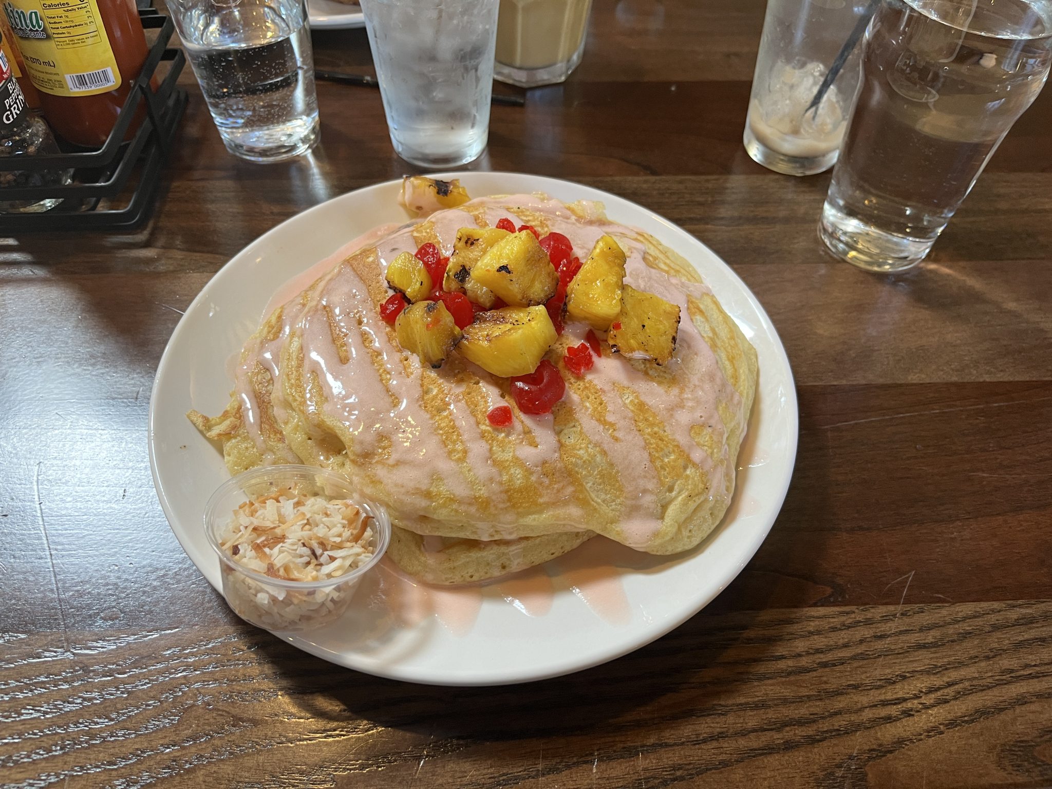 Alternative Text: Pancakes with toasted pineapple, maraschino cherries and cherry sauce on top. A small cup of toasted coconut next to them.
