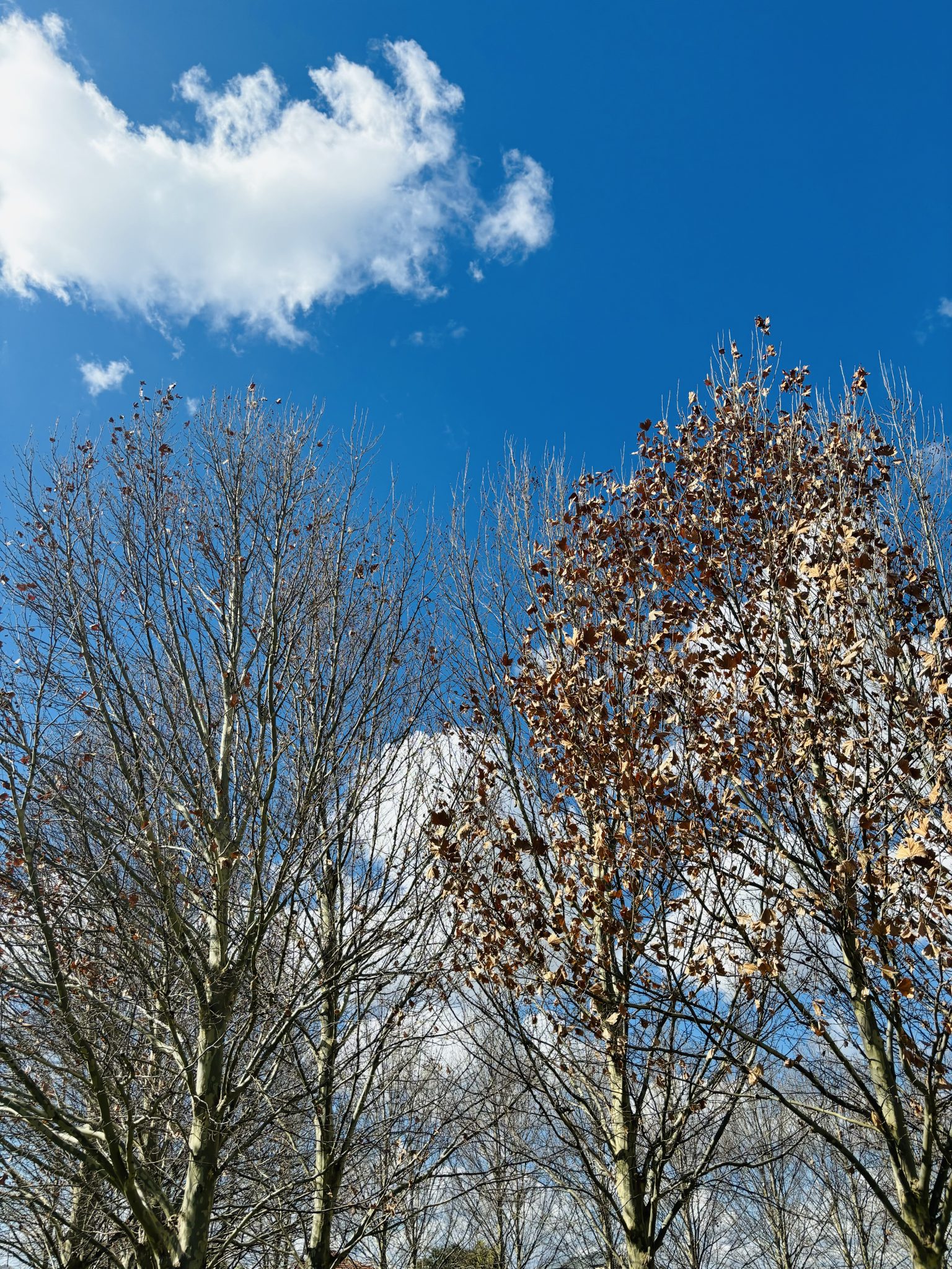 Alternative Text: Tall bare trees with traces of brown leaves stand against a bright blue sky with fluffy white clouds, highlighting the shift into autumn or winter.