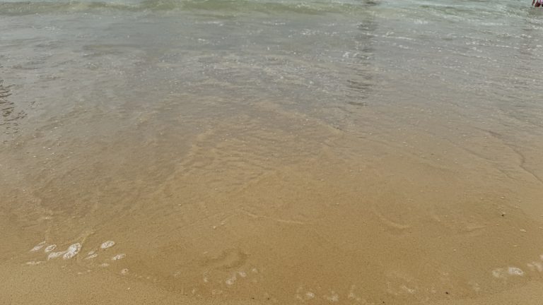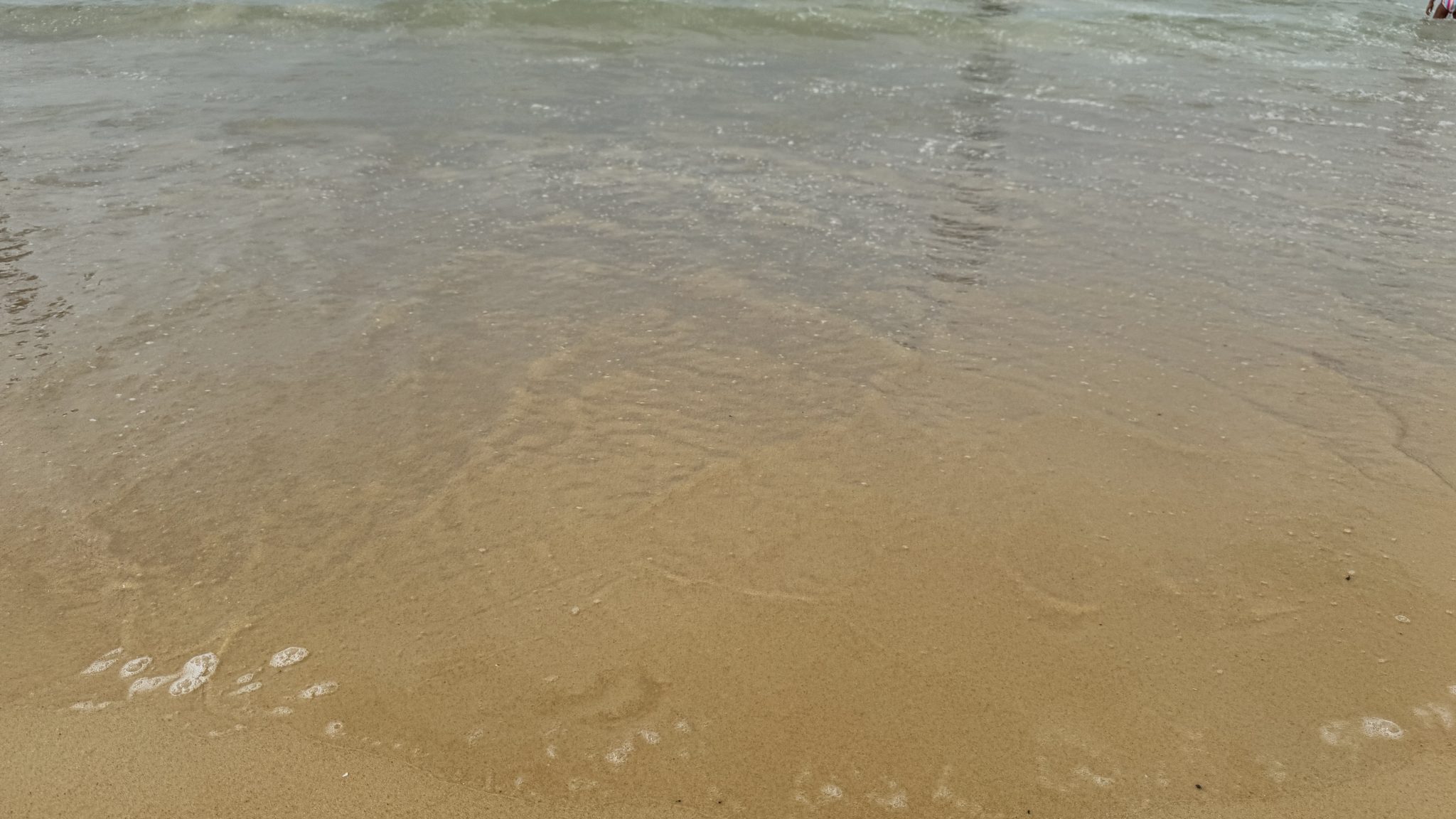 Alternative Text: A close-up view of a sandy beach where the water is gently lapping at the shore.