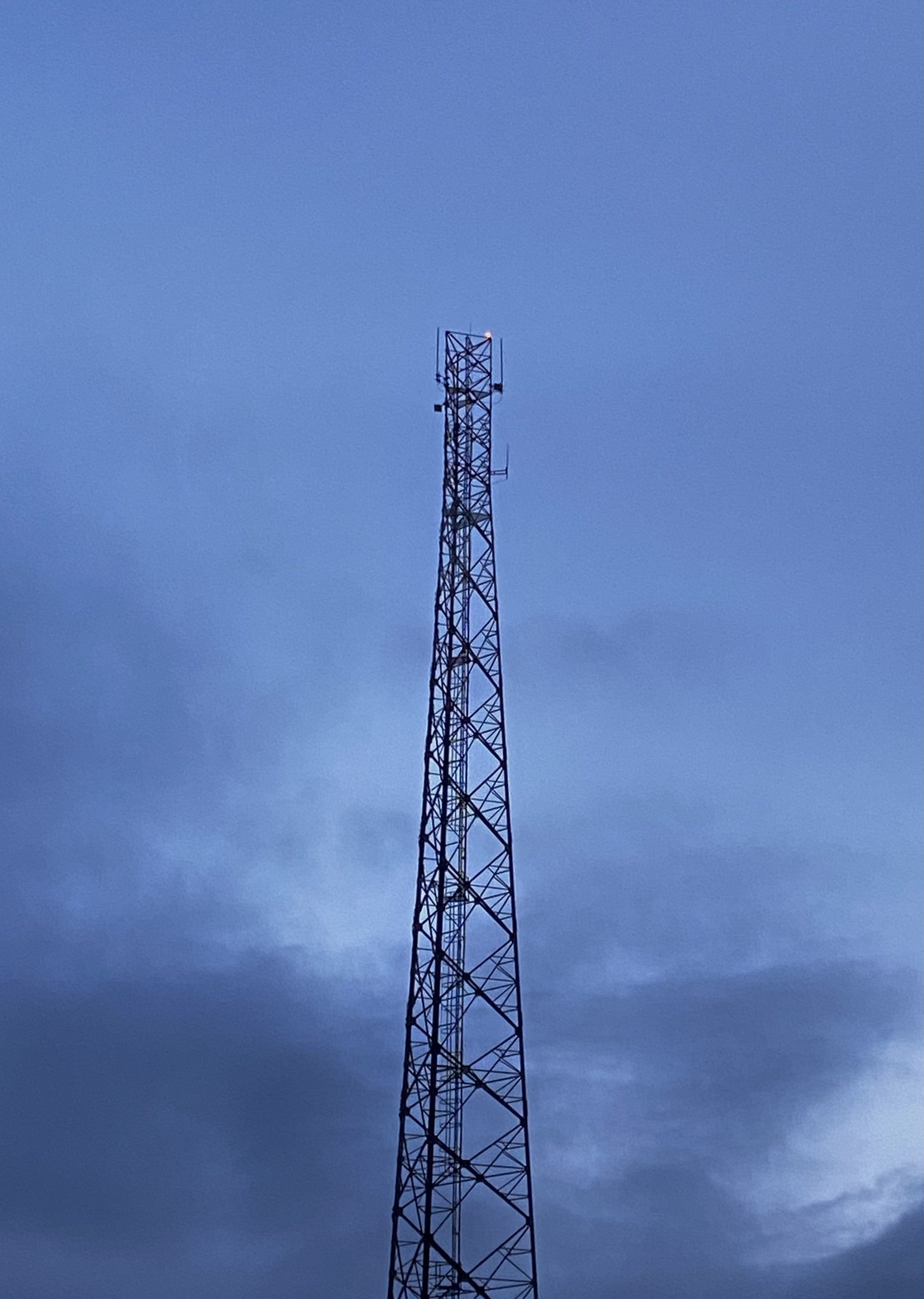Alternative Text: A tall, metal communication tower rises into a cloudy, twilight sky. The tower is constructed with a lattice design and has antennas mounted at the top and sides