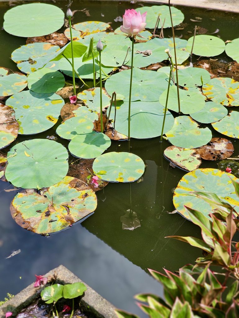 Alternative Text: A beautiful pink lotus in bloom among green leaves in a garden pond with its reflections. Taken at Hill Palace, Thrippunithura.