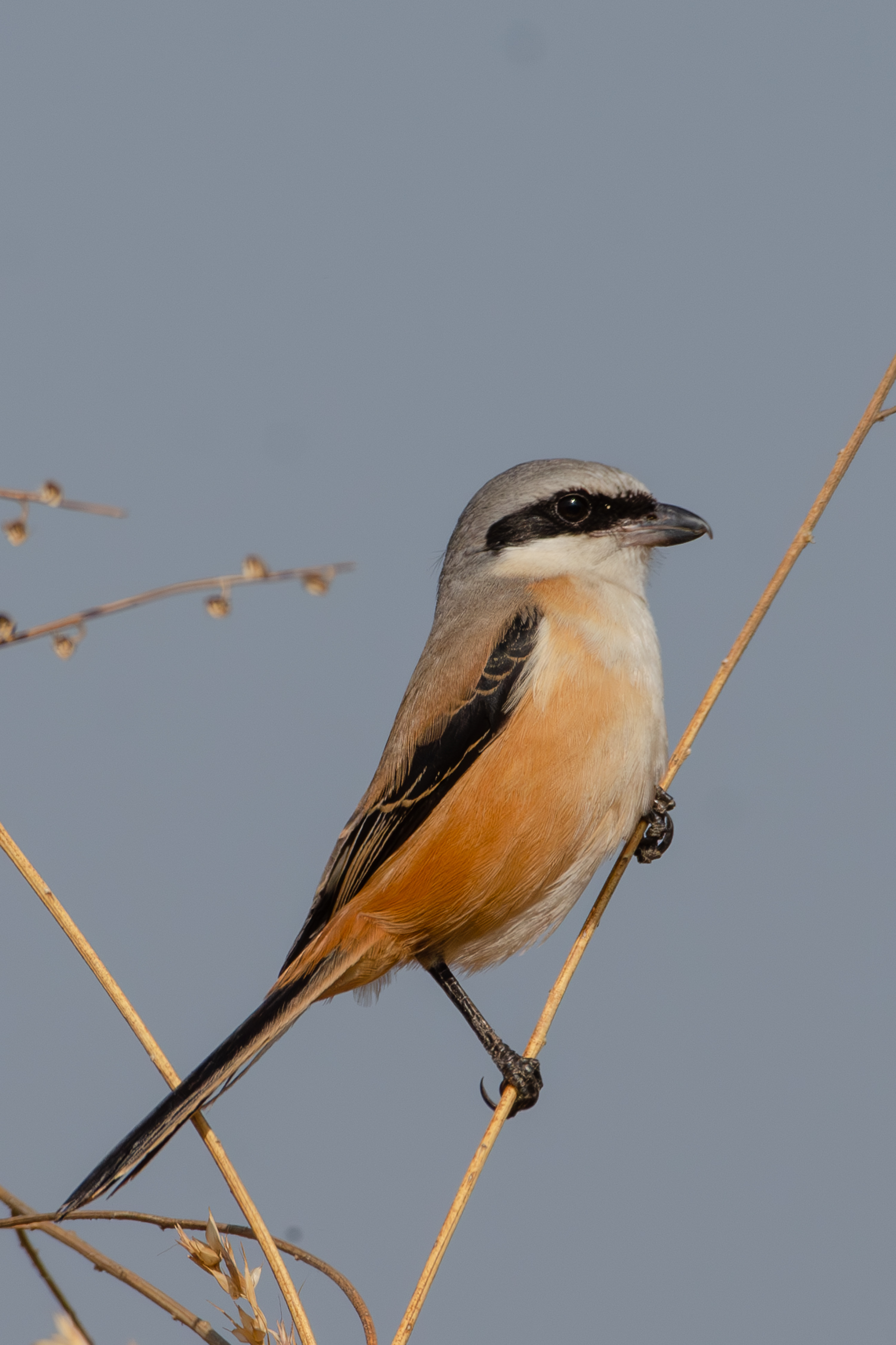 Alternative Text: A Long-tailed Shrike on a dry twig, with a grey crown, black mask, rufous-orange sides, and a long black tail.